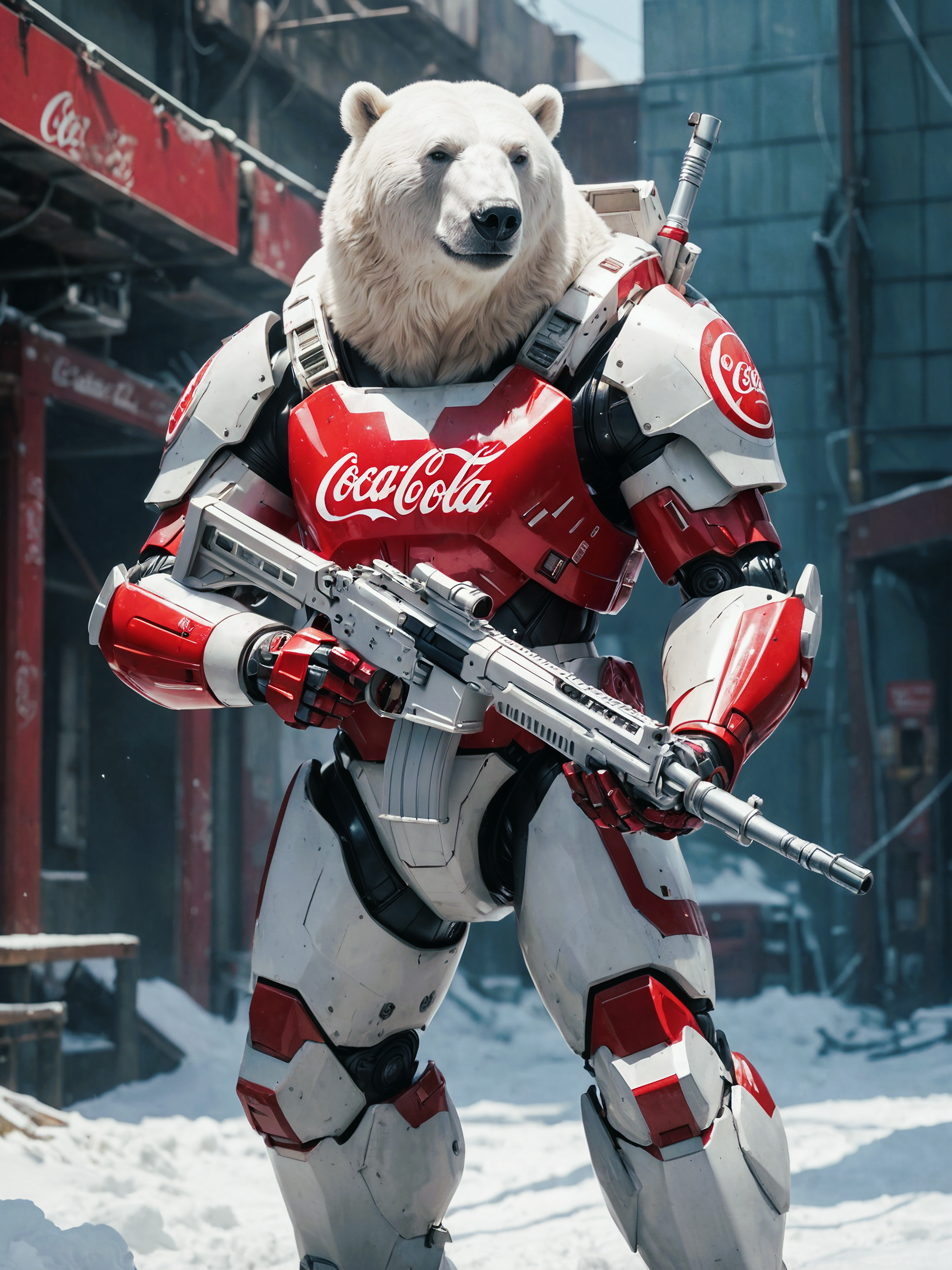 portrait, surrealistic, (bokeh:1.1), dof, awe-inspiring, majestic, overwhelming, humanoid polar-bear wearing (red coca-cola-military:1.1) metal sci-fi bulky (mecha armour:1.3) and sunglasses with (red beret:1.05) is holding a big (white rifle:1.35), harsh shadows, (sun rays:1.1)