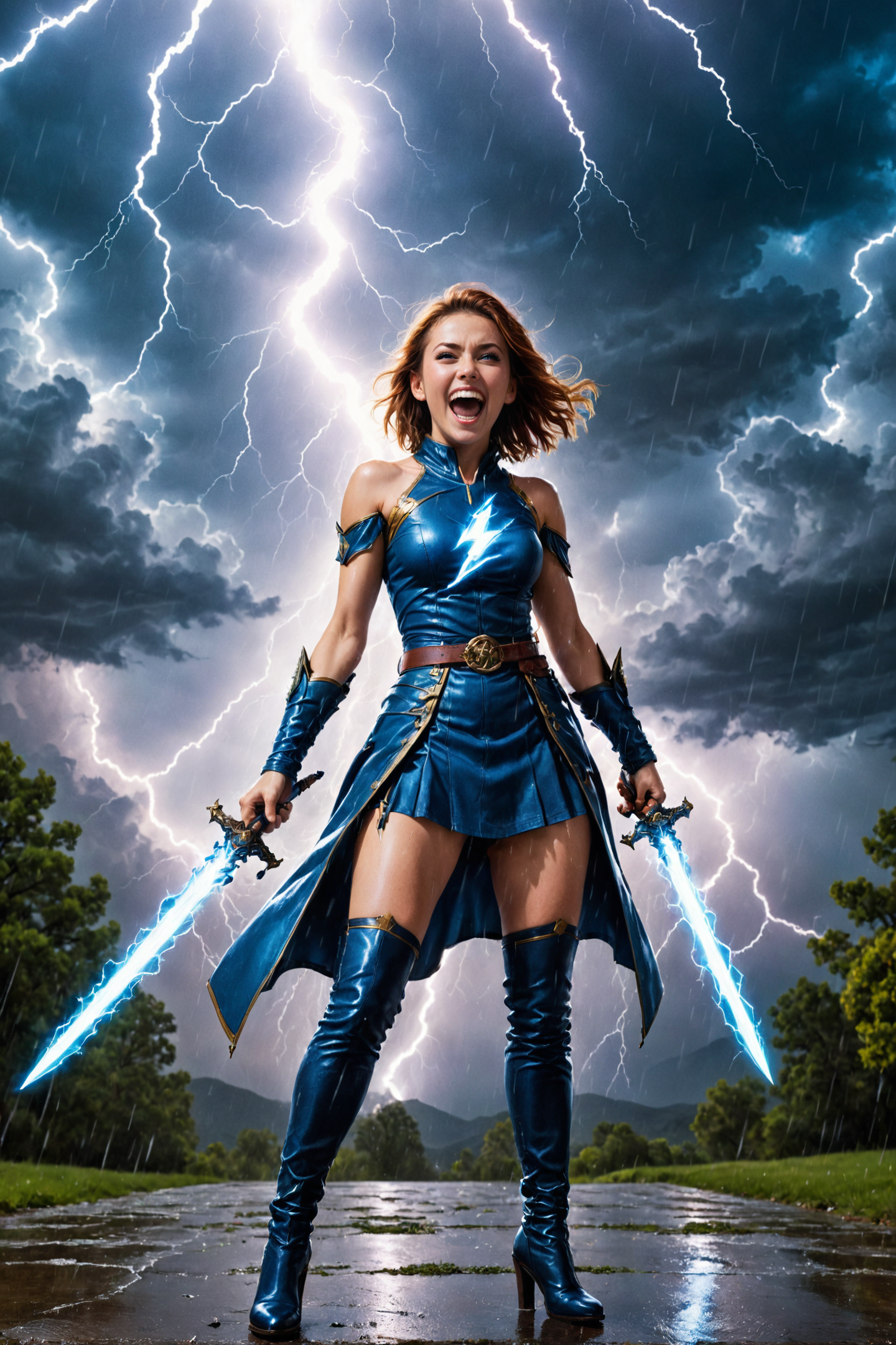 by Joseph Stella and Olivier Valsecchi in the style of Ted Nasmith and __artist_fav__, full body length, cute heroine holding two (((lightning swords))), casting a blue lightning spell, tights, bare shoulders, lightning, symmetrical, rain, digital oil pastel on canvas, extremely detailed, vibrant dream, adorable happy maniacal laughter, two swords, rain <lora:oil_pastel:1.00> <lora:more_art:0.30> <lora:huge_anime_eyes:0.85> <lora:great_lighting:1.30> <lora:aesthetic:2.15> <lora:photorealistic_portrait:1.25> <lora:RMSDXL_Enhance:0.55> <lora:RMSDXL_Creative:0.45> <lora:RMSDXL_Photo:0.45> <lora:RMSDXL_Darkness_Cinema:0.50> <lora:XDetail_heavy:0.75> <lora:perfect_eyes:0.15> <lora:perfect_hands:0.25> <lora:midjourney:-0.20> <lora:looking_at_viewer:1.25> <lora:clothing_slider:6.00> <lora:dpo:0.50> <lora:extremely_detailed:2.25> <lora:vibrant_dream:2.25> <lora:happy_v2:0.35> <lora:maniacal_laughter:2.25> <lora:faetastic:0.25> <lora:add_detail:0.25>