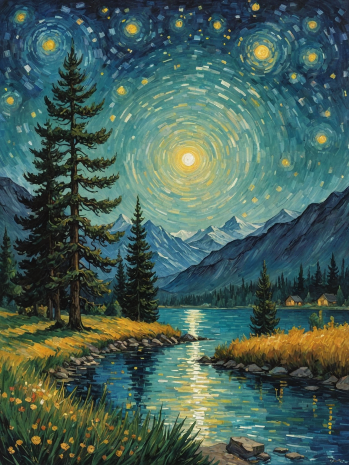 Colorful vincent van gogh starry night sky :: cinematic 16k resolution masterpiece illustration painting consisting of oil, watercolors and ink :: mountains pine tree forest lake flowers :: frisco watercolors and oil sky raining shooting stars twinkling stars glistening stars glittery stars large full moon stars :: Ivan Aivazovsky Kentaro Miura Gustave Doré Greg Rutkowski romantic naturalism starry night landscape :: intricate motifs perfect composition masterpiece insanely-detailed extreme-detailed hyper-detailed beautiful volumetric deep rich colors volumetric lighting shadows Ray tracing smooth perfect texture