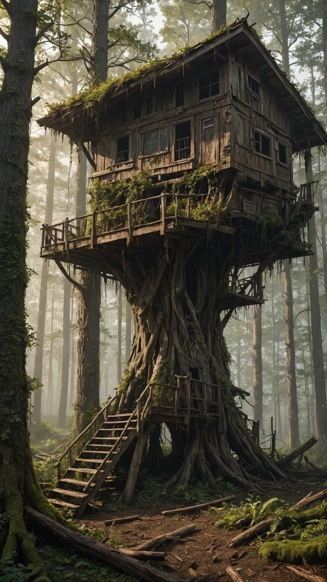 digital art,post-apocalyptic scene,dilapidated treehouse,overgrown vegetation,swampy area,lone survivor,rough textures,muted earth tones,scattered debris,atmospheric mood,concept art,visual storytelling,mystery,survival theme,wooden structures,foggy background,broken wood planks,dense forest,dark forest,ambient lighting,exploration,environment art,rustic aesthetic,art inspiration from nature's reclaiming of human constructs,bark details,art style reminiscent of video game concept art.,<lora:more_details:1>,
