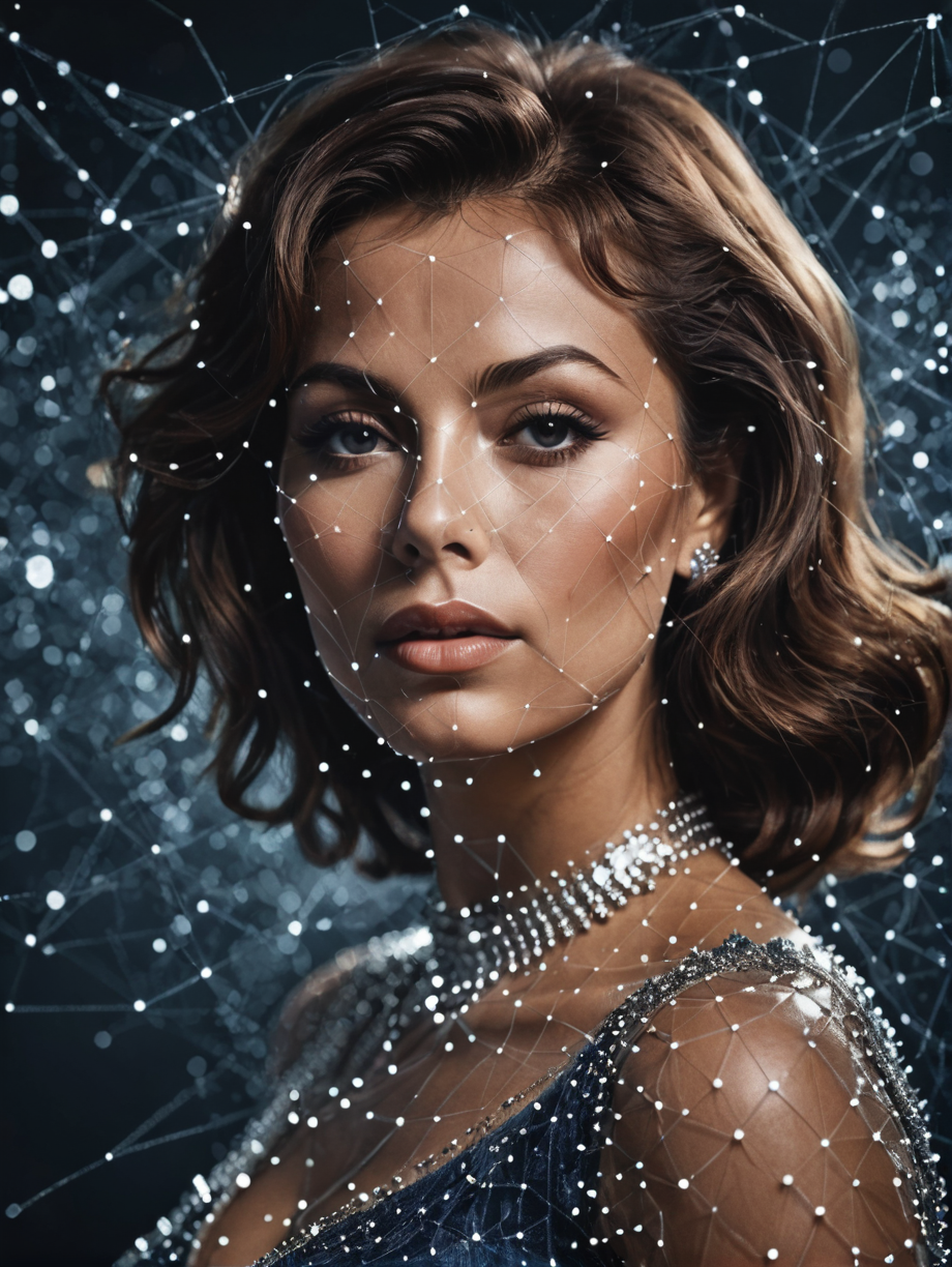 dataviz style, the silhouette of a young sofia loren rendered as a mesh grid, datapoints, sparkles, blue tones, stars <lora:dataviz_style_xl_v1:1>