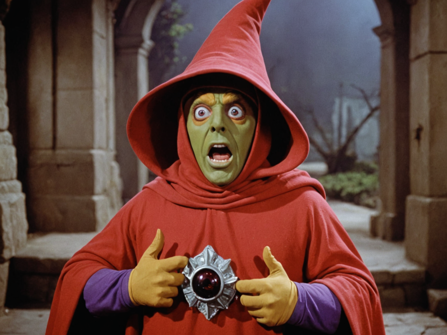Technicolor 1940s film still of Orko from The Masters of the Universe, movie still