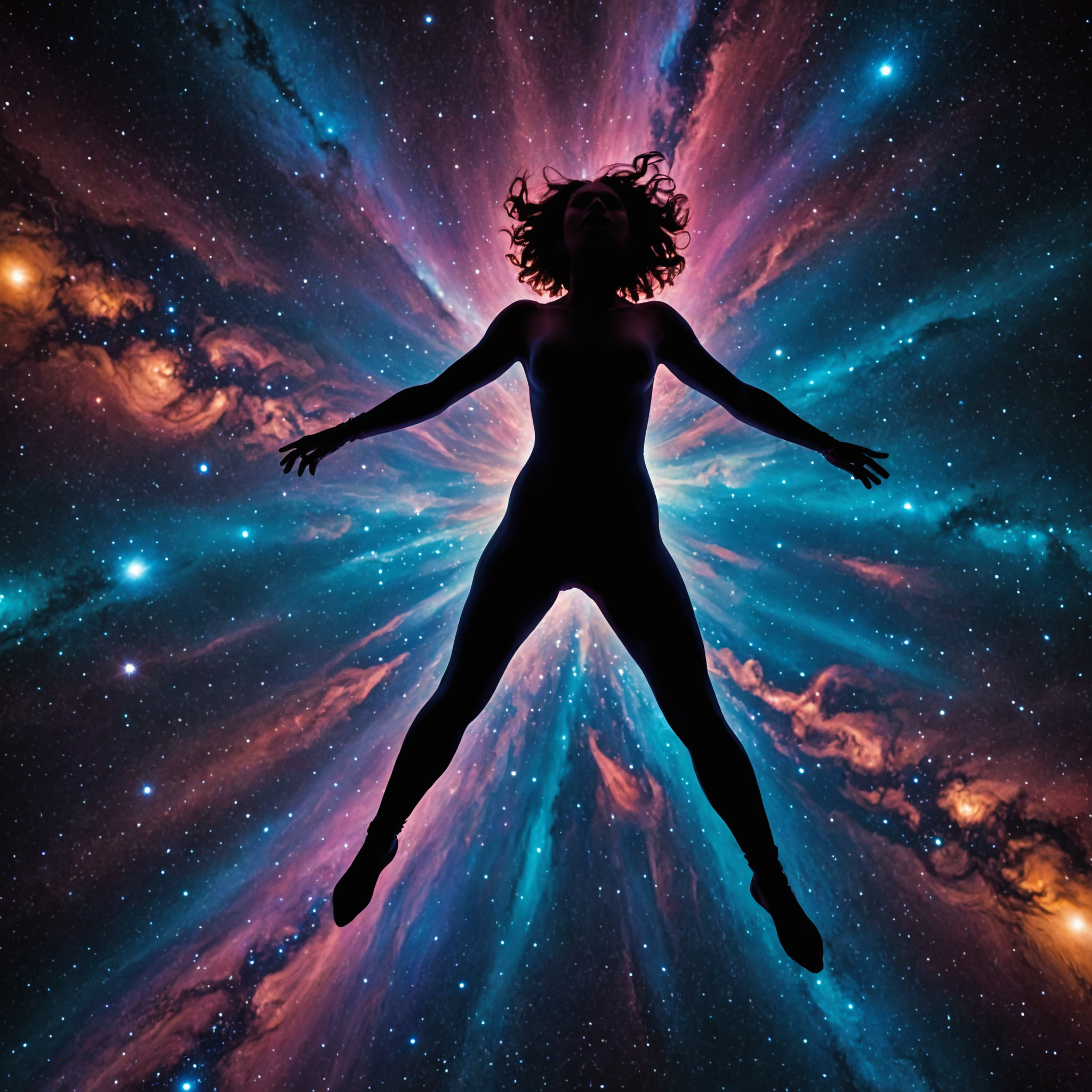 psychedelic image, wide angle shot, in space,silhouette of a woman, falling through space,stars, vibrant colors, bodysuit,<lora:RMSDXL_Enhance:2>