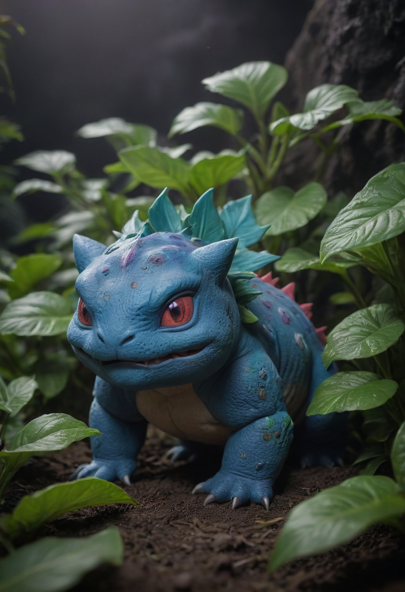 closeup award winning photo of Ivysaur\(pokemon\), perfect environment, extremely detailed, dark shot