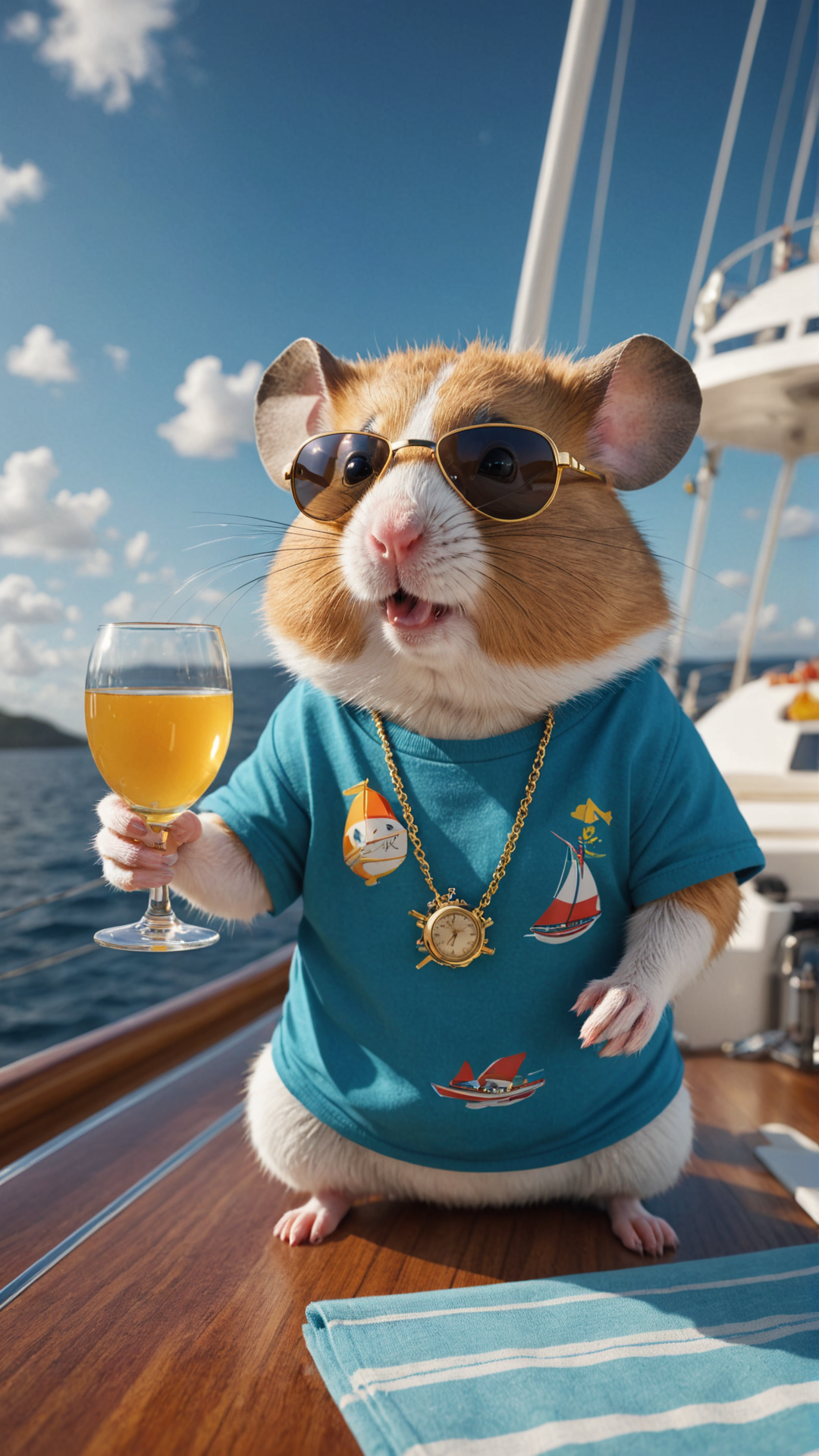 photorealistic cute hamster,on expensive yacht in a deep ocean,drinking champain,wearing colorful modern tshirt,Wearing an expensive golden watch and expensive sunglasses,