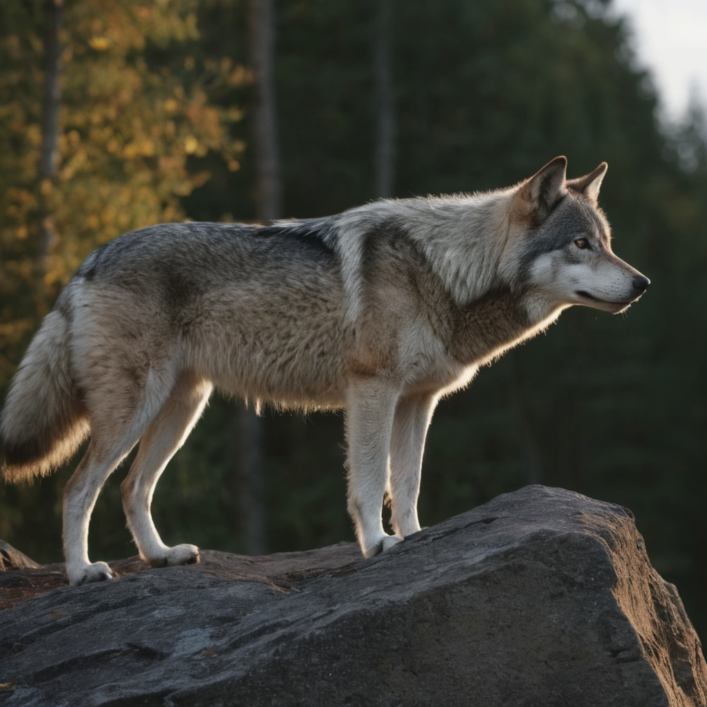 timber wolf on the prowl on a rocky ledge, early morning light