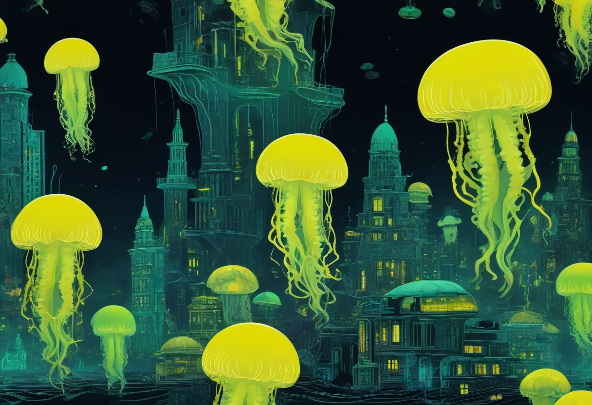 retro ink, underwater city background, chubby jellyfish, neon green and yellow, <lora:Retro_Ink_SDXL:0.8>
