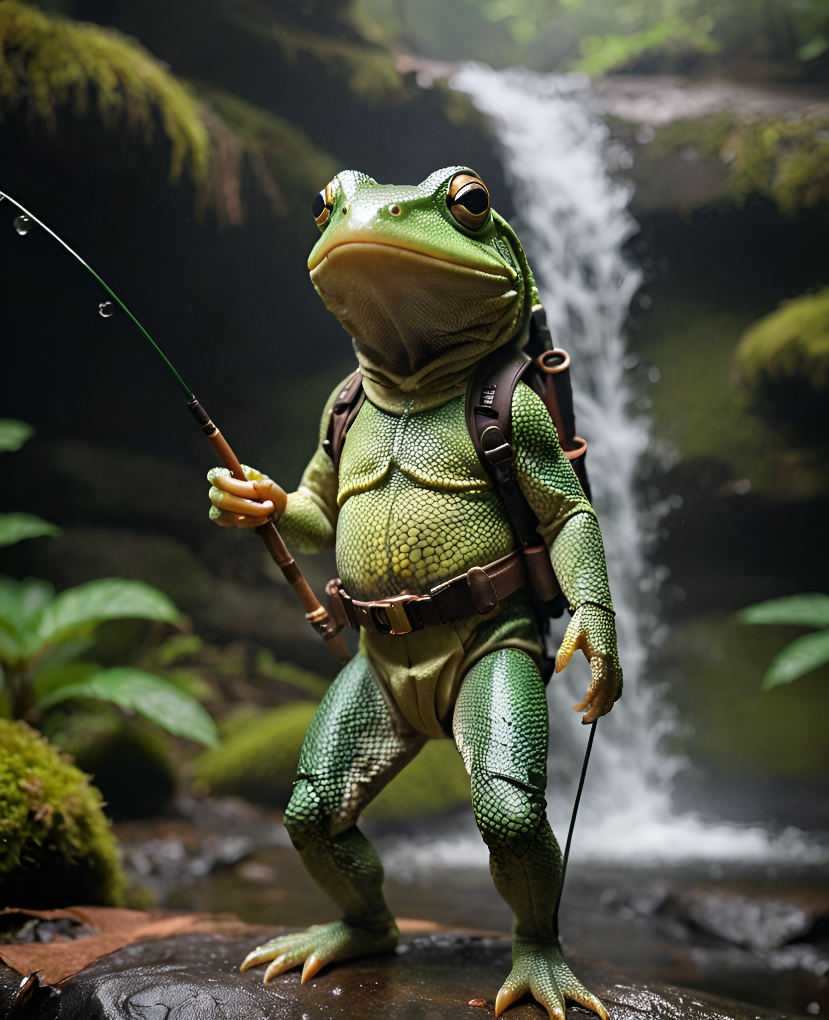 Portrait of a small forest creature with fishing pole, reptile, amphibian, leather harness, bikini, macro photography, hard light, waterfall mist