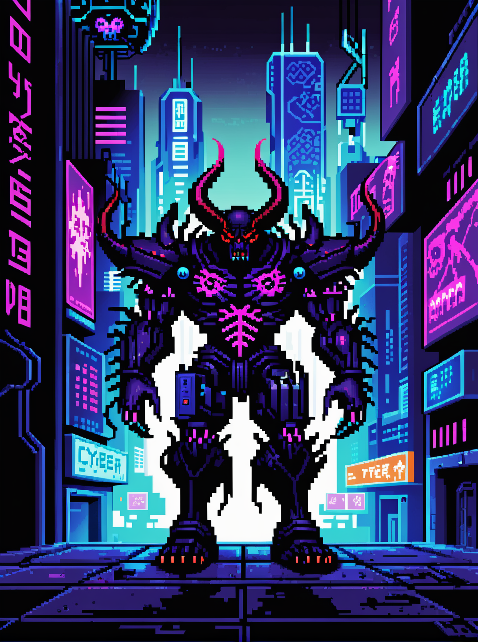 dosegagfx style,Pixel art of cybernetic demon, cyberpunk city background<lora:SDXL_game_dosvga style_dosvga:1>