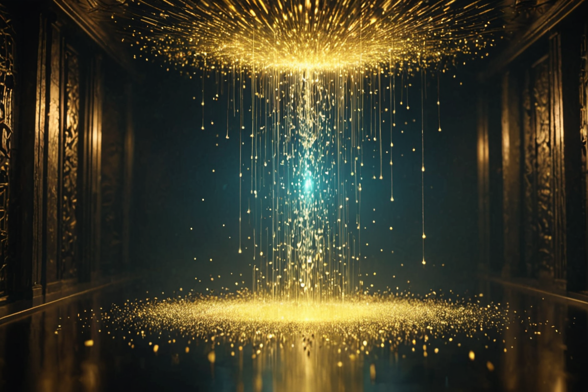 Movie still. Inside dataviz gold volumetric caustics, sparkling magical plasma aura, Mist