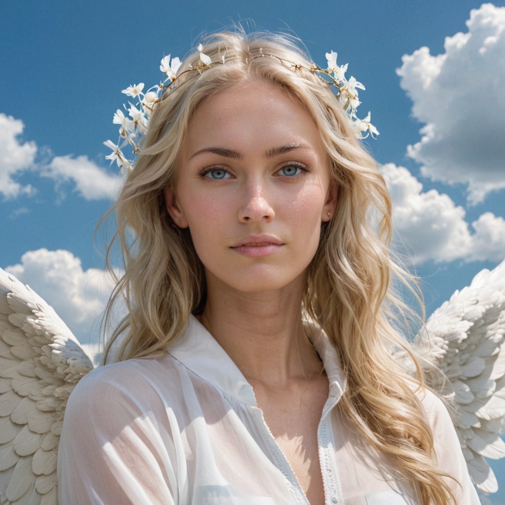 close-up photo of a woman as an angel, blonde hair, white halo, white clouds and heavenly sky, looking at viewer, <lora:megfox_xl_1_standard_merger_23_41_07_03:1>