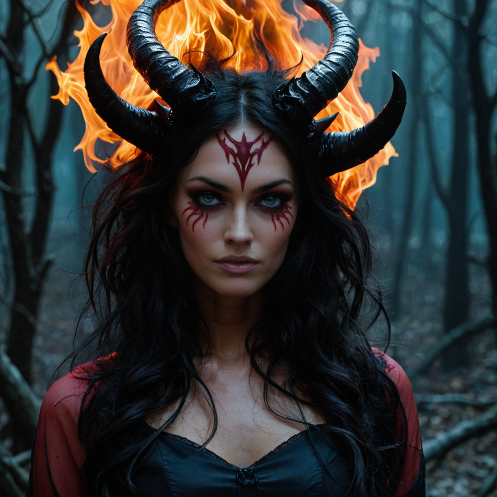 Dreamscape close-up photo of a woman as an devil, black hair, red horns, blazing eyes, dark and evil environment, chaos, looking at viewer, <lora:megfox_xl_1_standard_merger_23_41_07_03:1> . Surreal, ethereal, dreamy, mysterious, fantasy, highly detailed