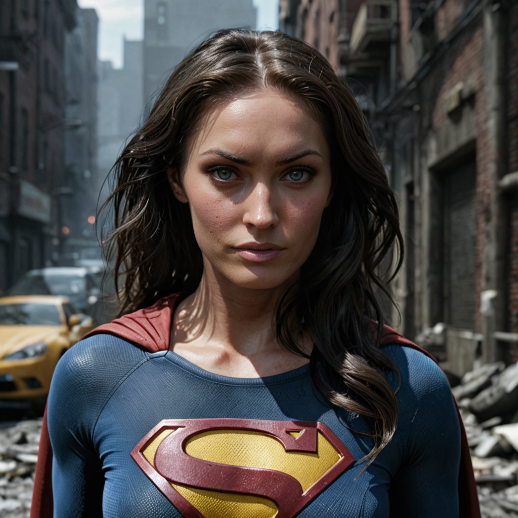 Hyperrealistic art close-up photo of a woman as superman, at arkham city, looking at viewer, <lora:megfox_xl_1_standard_merger_23_41_07_03:1> . Extremely high-resolution details, photographic, realism pushed to extreme, fine texture, incredibly lifelike