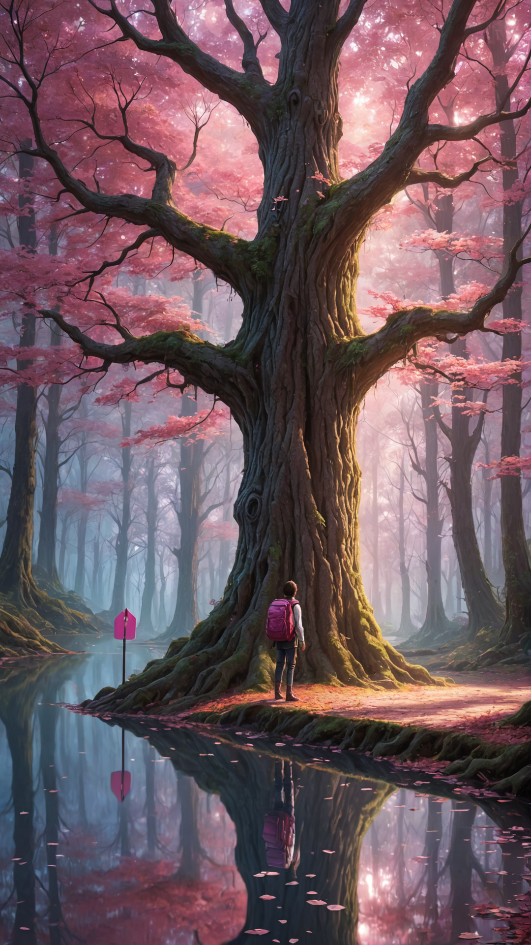 Enchanted forest,mystical,tall trees,oversized pink leaves,soft-glowing lights,ethereal atmosphere,fantasy setting,direction signs,"The Big Tree" sign,subtle cool and warm color palette,illuminated path,shimmering reflections on water,small humanoid figure,backpack,sense of adventure,exploration,magical realism,digital painting,concept art,high-resolution,vertical composition,dramatic lighting,serene,tranquil environment,otherworldly.,