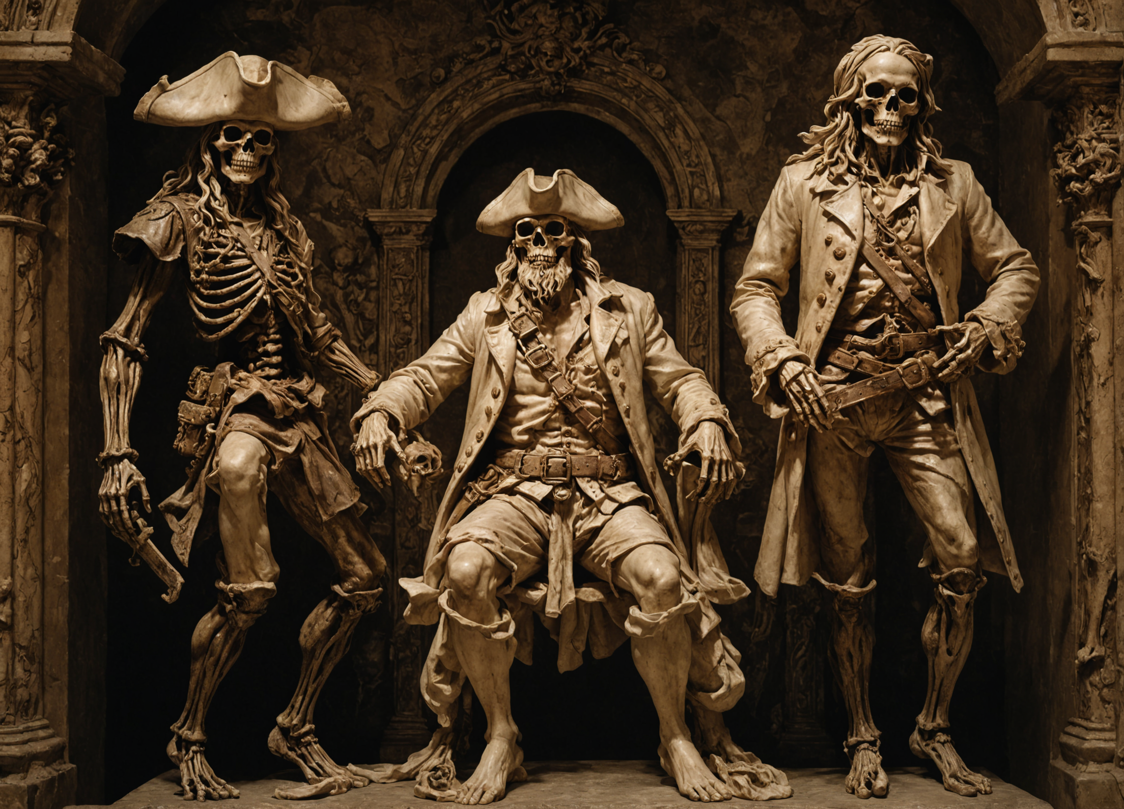 (alabaster and bronze sculptures of pirates, ships and skeletons:1.2). Baroque motifs, Gothic architecture, Rococo style. By Kris Kuksi and Auguste Rodin and Gian Lorenzo Bernini.dim,dramatic lighting,cinematic,movie still