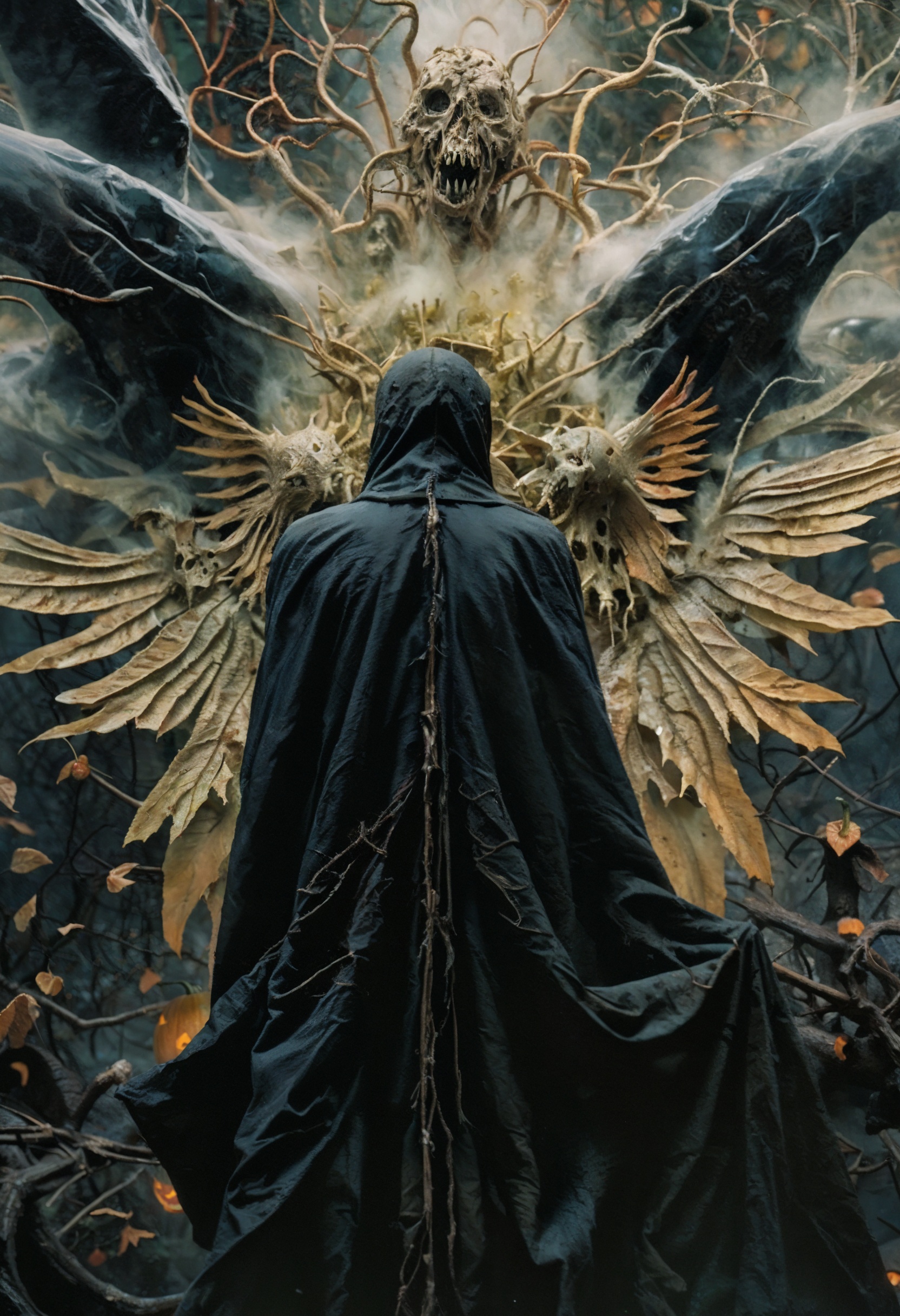 rpg board game card art, card design, art by zdzislaw beksinski:0.7 and kris kuksi:0.6, scared expression, liquid insanity, magnetic allure, dark and mysterious, a hauntingly beautiful tormented photo, scarecrow from the batman, face covered in gunny sack, villain, psychological trauma, covered in mold and mildew, Halloween, pumpkin monsters in the background, insanely detailed and intricate, hyper maximalist, elite, horror, creepy, ominous, haunting, cinematic, society, colossal, James jean, Brian Froud, liquid insanity, magnetic allure, dark and mysterious, a hauntingly beautiful tormented photo, a beautiful girl in the middle of the photo, monsters in the background