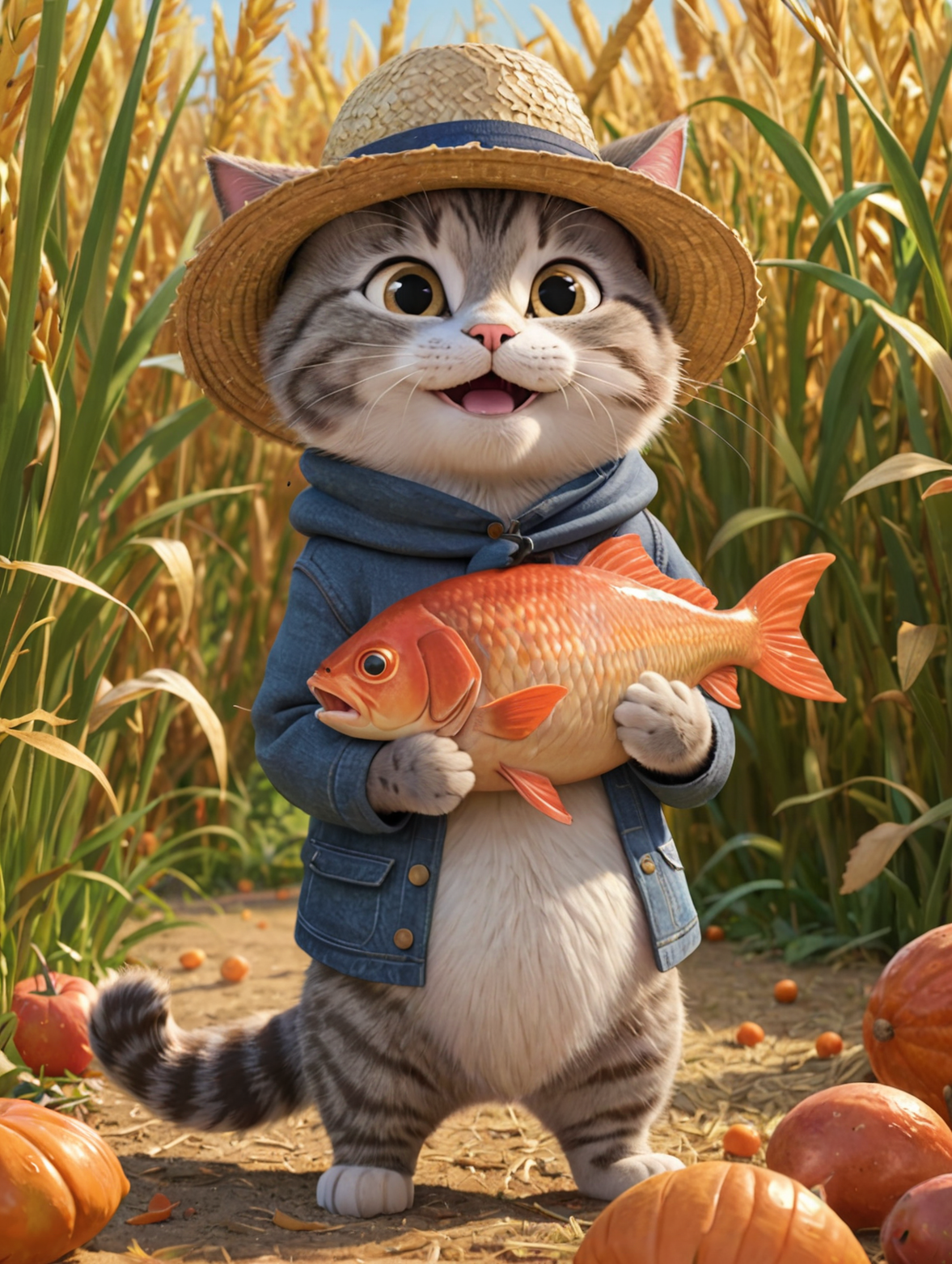 cartoon,disney pixar style,best quality,high res,RAW,<lora:add-detail-xl:0.8>,a cute cat hug a huge fish,in filed,straw_hat,happy tears,excited,autumn,harvest,fishes,crops,golden theme,