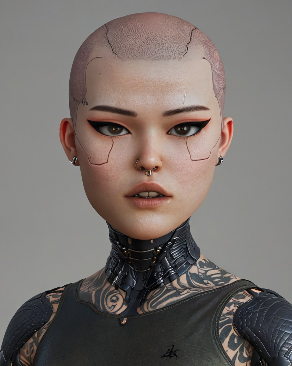 Aggressive thin Izanami, she has Bald hair styled as Buzz cut, curly hair, <lora:zavy-cbrpnk-sdxl:1> zavy-cbrpnk, faceplate