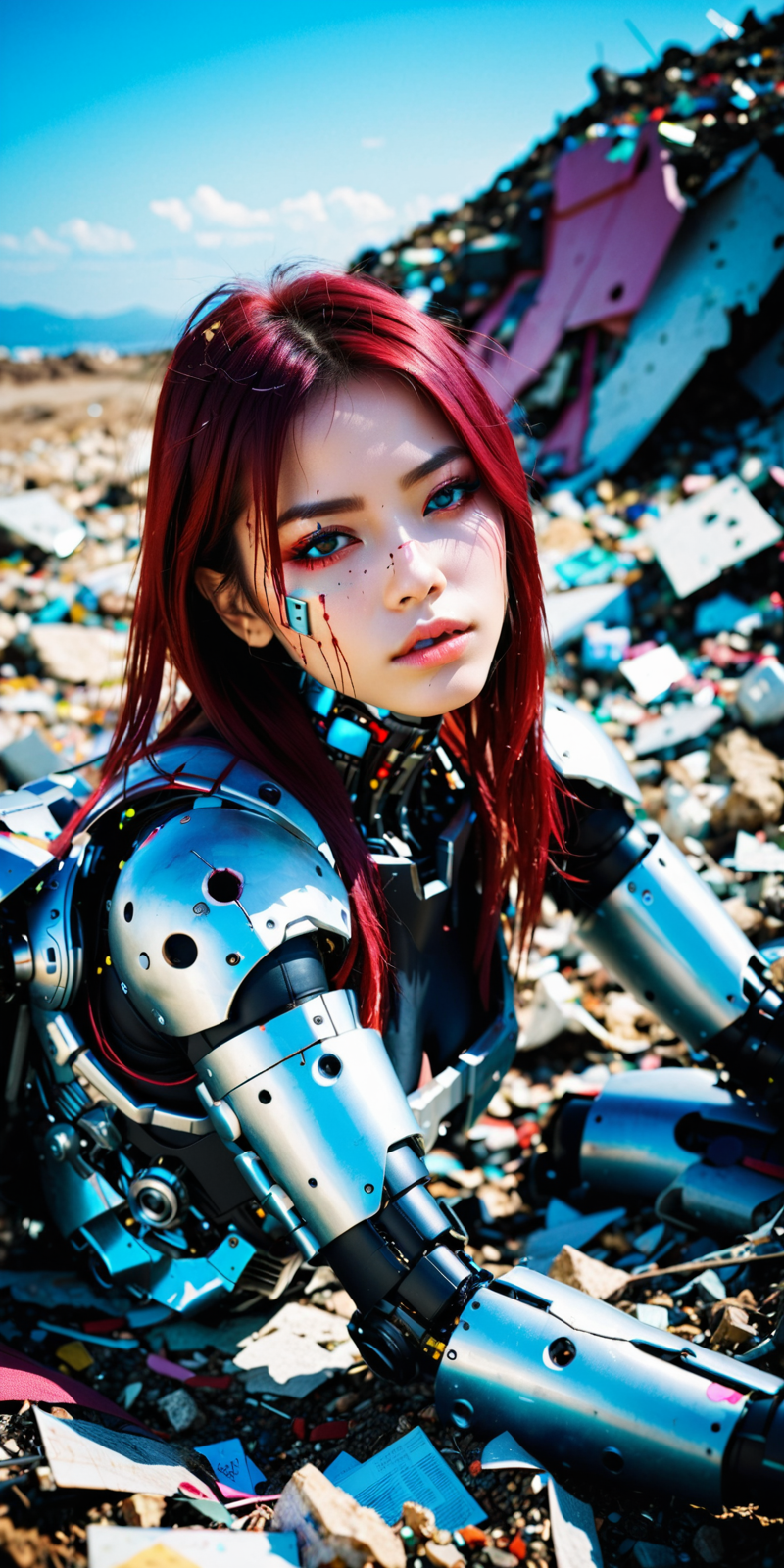 Photo of a broken ruined cyborg girl in a landfill, robot, body is broken with scars and holes, half the face is android, laying on the ground, creating a hyperpunk scene with desaturated dark red and blue details, colorful polaroid with vibrant colors, (vacations, high resolution:1.3), (small, selective focus, European film:1.2), art by Otomo Katsuhiro