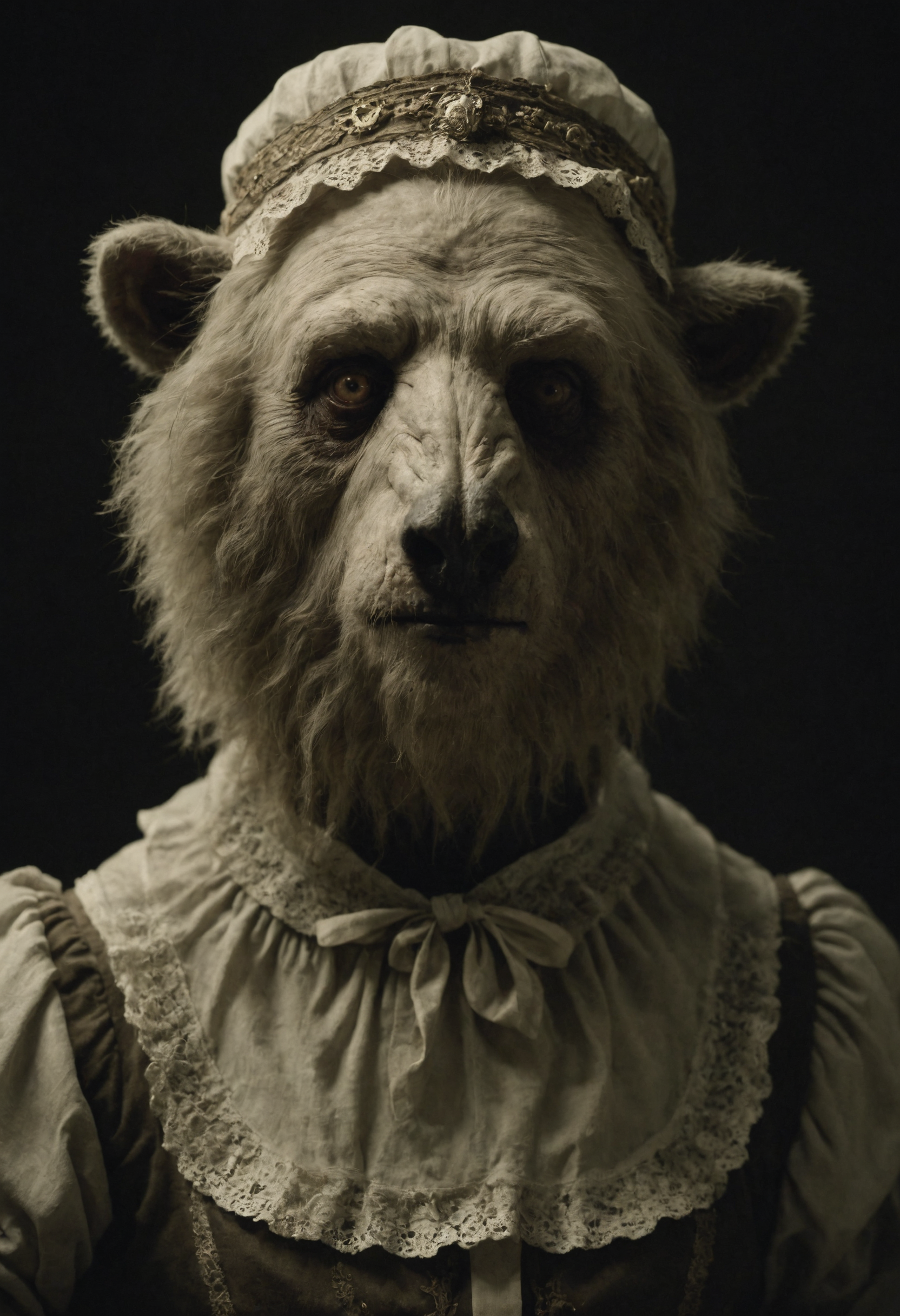 unsettling, (eerie vintage:1.1), frontal facing (close up face portrait:1.1) of a wizened anthropomorphic ([(bear:1.3):(yeti:1.1):5] maid:1.1), (muted color scheme:1.1), vignette effect, (tense foreboding mood:1.1), (weird indie rpg game:1.1), desolate, slavic folklore, concept art, (black background:1.1), eldritch horror