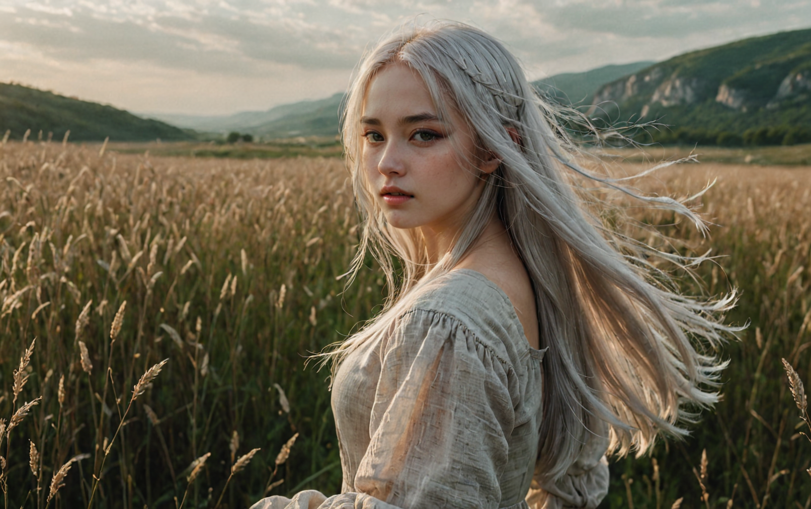 (high quality,masterpiece:1.2),realistic,8k wallpaper,extremely detailed,cinematic,1girl,beautiful face,long platinum hair,billowing_gauze_linen,loose sleeves,wild field,stunning landscape,medium shot,wide_shot,<lora:PerfectEyesXL:1>,<lora:add-detail-xl:1>,<lora:JuggerCineXL2:1>,