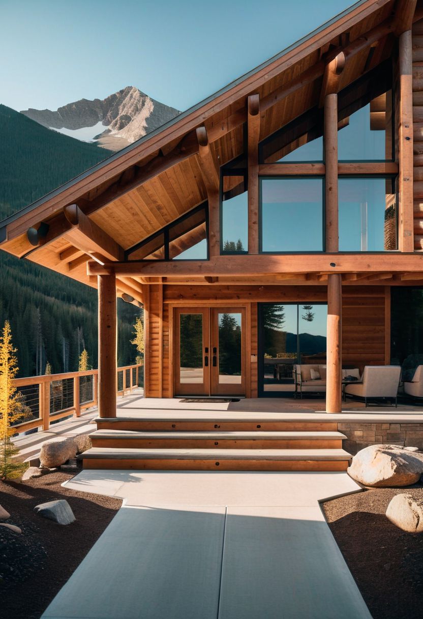 Architectural photography of a modern mountain cabin, street view, professional color grading, soft shadows, no contrast, clean sharp focus, film photography, evenly lit bright, mountains outside home room ((Painstaking Attention To Details))