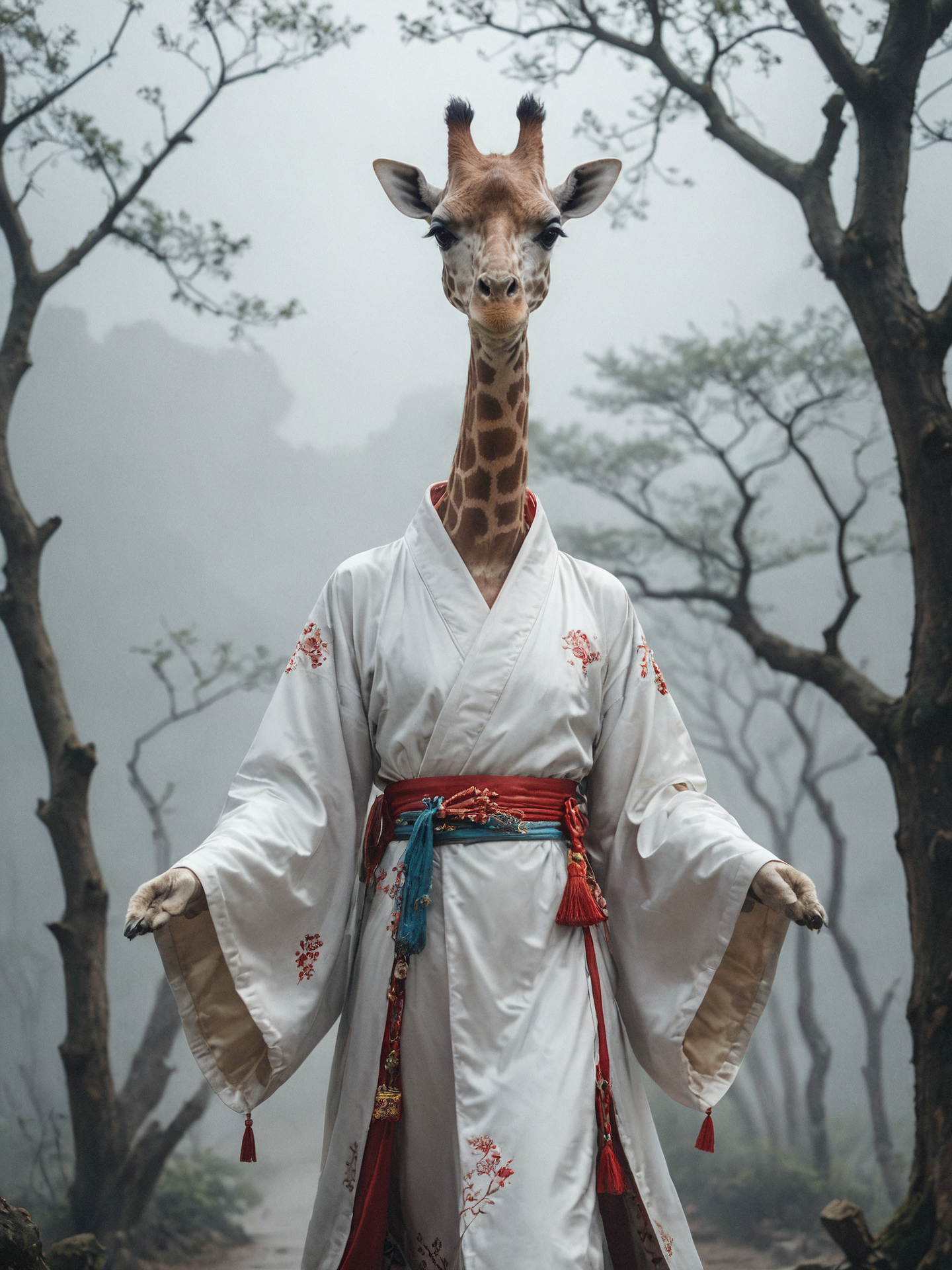 anthropomorphic giraffe wearing Hanfu robe, Chinese traditional clothing, cold temperament, high-end design style, tall figure, Cloud and mist entanglement, Artistic, White color tone, Long Shot, Mysterious feeling, mythological legend, dynamic shot,16K, cinematic fil still, amazing quality, high fashion editorial, glsl shaders, wallpaper, film grain, <lora:aesthetic_anime_v1s:1.0>, <lora:xl_more_art-full_v1:0.5>, <lora:add-detail-xl:0.3>