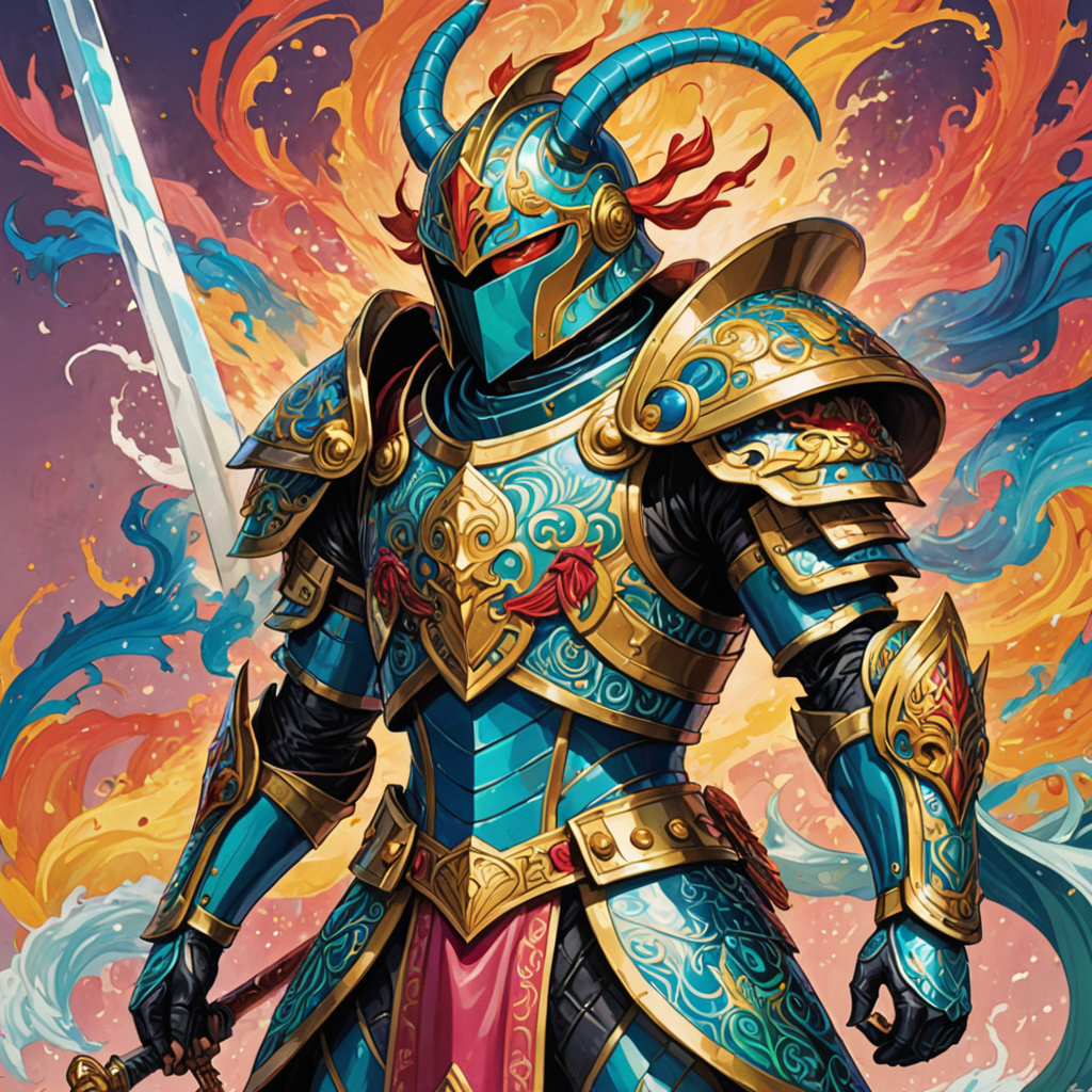 The hot-headed eldest son of a mighty noble, is depicted as a bold and brash warrior, dressed in elaborate armor adorned with the his family crest. His demeanor is aggressive and impulsive, reflecting his confrontational nature. solemn Marsh disturbed weather Artus Scheiner, Emmy Bridgwater, Ayami Kojima psychedelic style . vibrant colors, swirling patterns, abstract forms, surreal, trippy