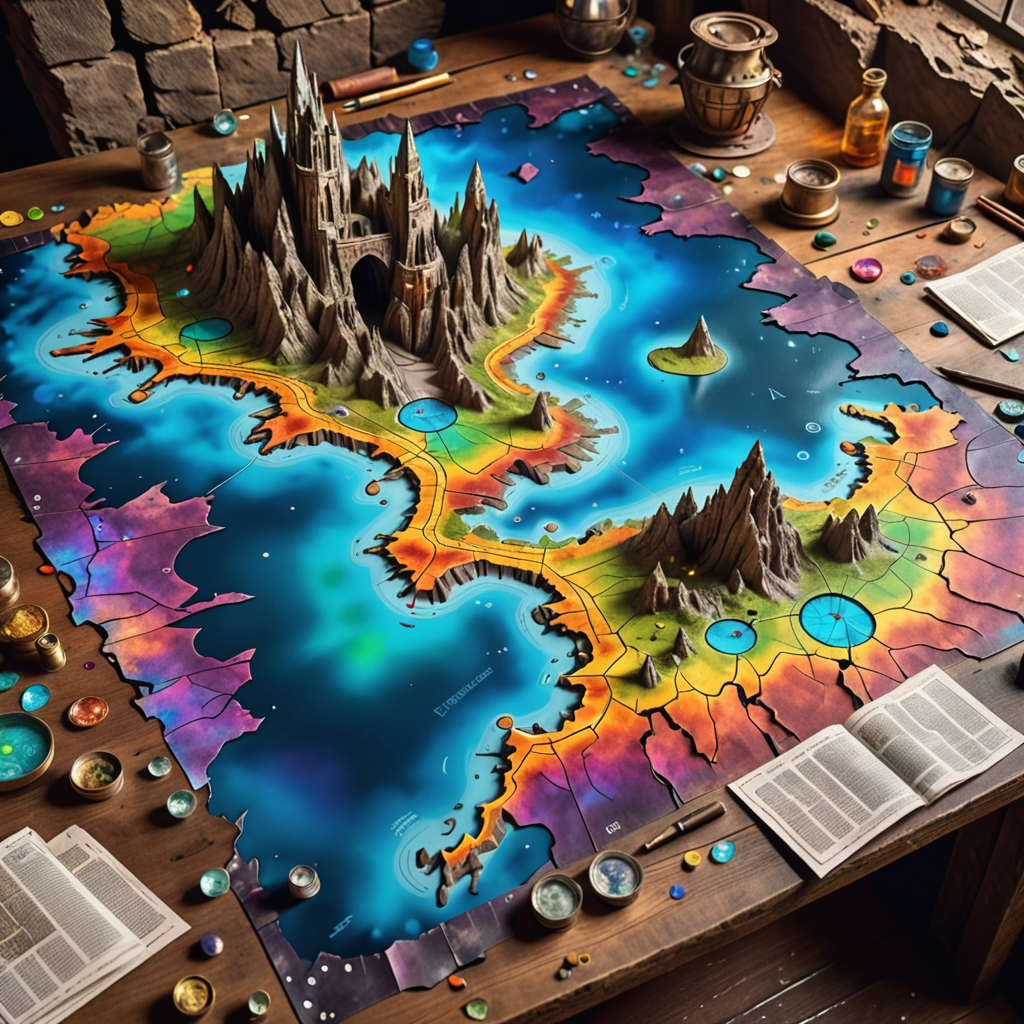 top view of a holographic magical map (3D, mining tunnels), torn and worn, map looks to be floating off the paper, sitting on a wizard's desk, magical multicolored ink, high quality, imagination, 8k, fantasy art, vivid magical colors, style-paintmagic