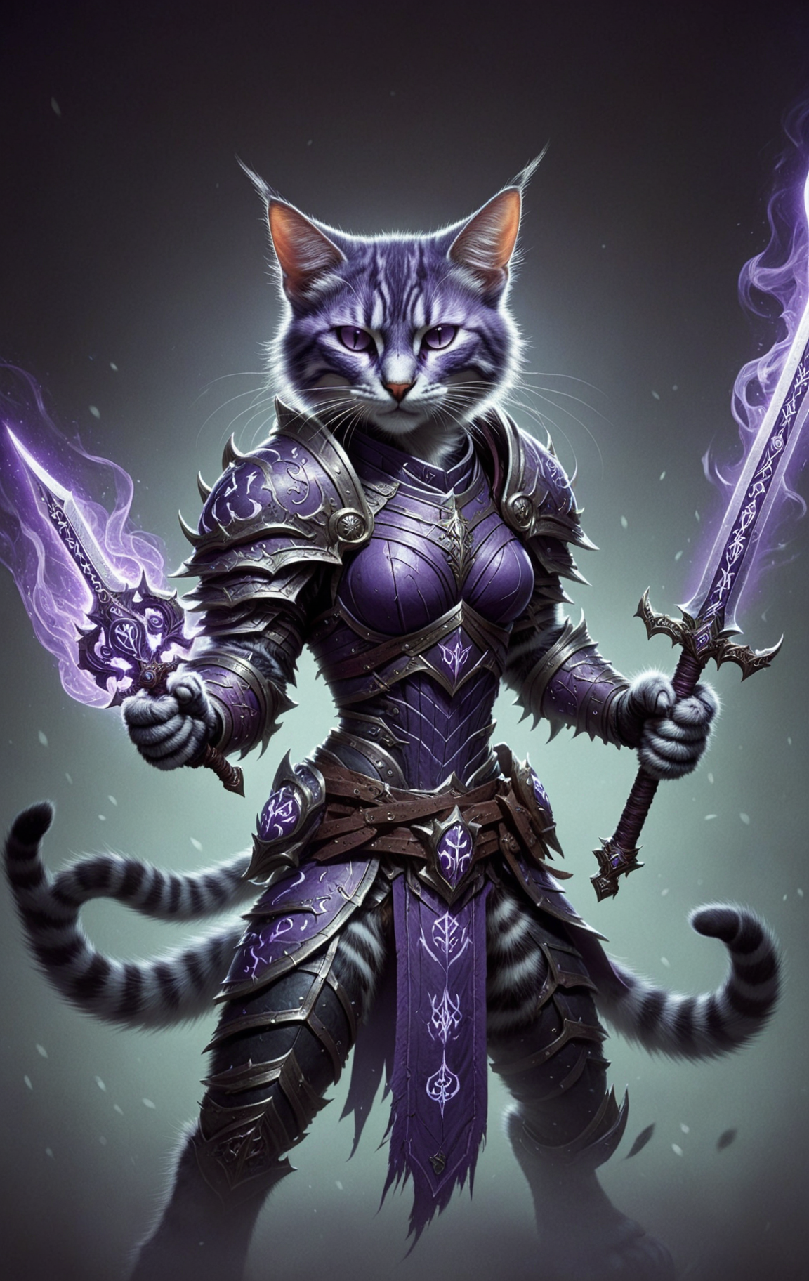 female cat, death knight, DonMD34thKn1gh7XL wielding runeblade, purple glowing runes, two handed sword, dual wielding <lora:DonMD34thKn1gh7XL-v1.1-000010:0.8>