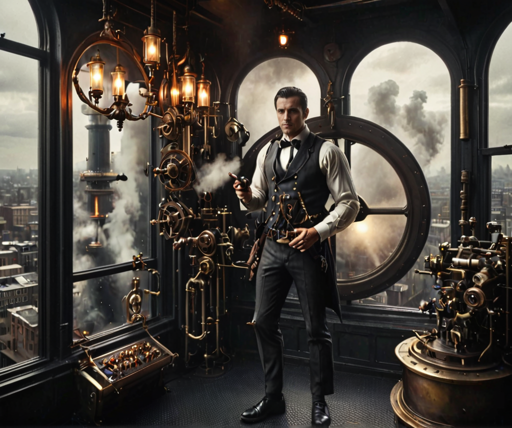 man wearing vest, blouse and pants with a single mechanical arm, behind (a round window showing a crowded city, factory, smokestack, fog) <lora:SteamPunkNoireAI:1> steampunknoireai