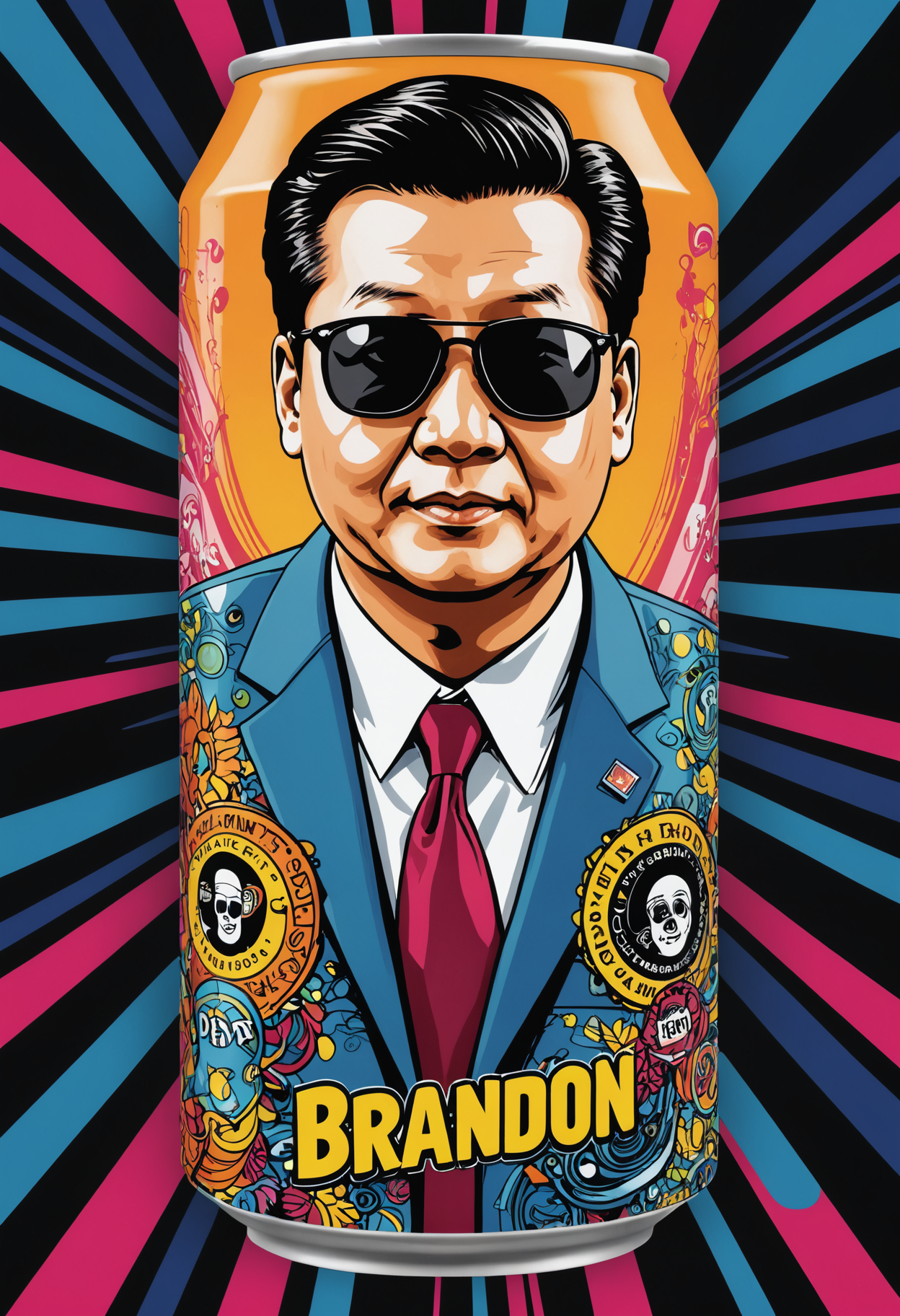[Xi Jinping] anthropomorphic beer can, iconic manga illustration, (("Dark Brandon" text logo)), edgy, psychedelic, kawaii, pop art, [wearing ray-ban]