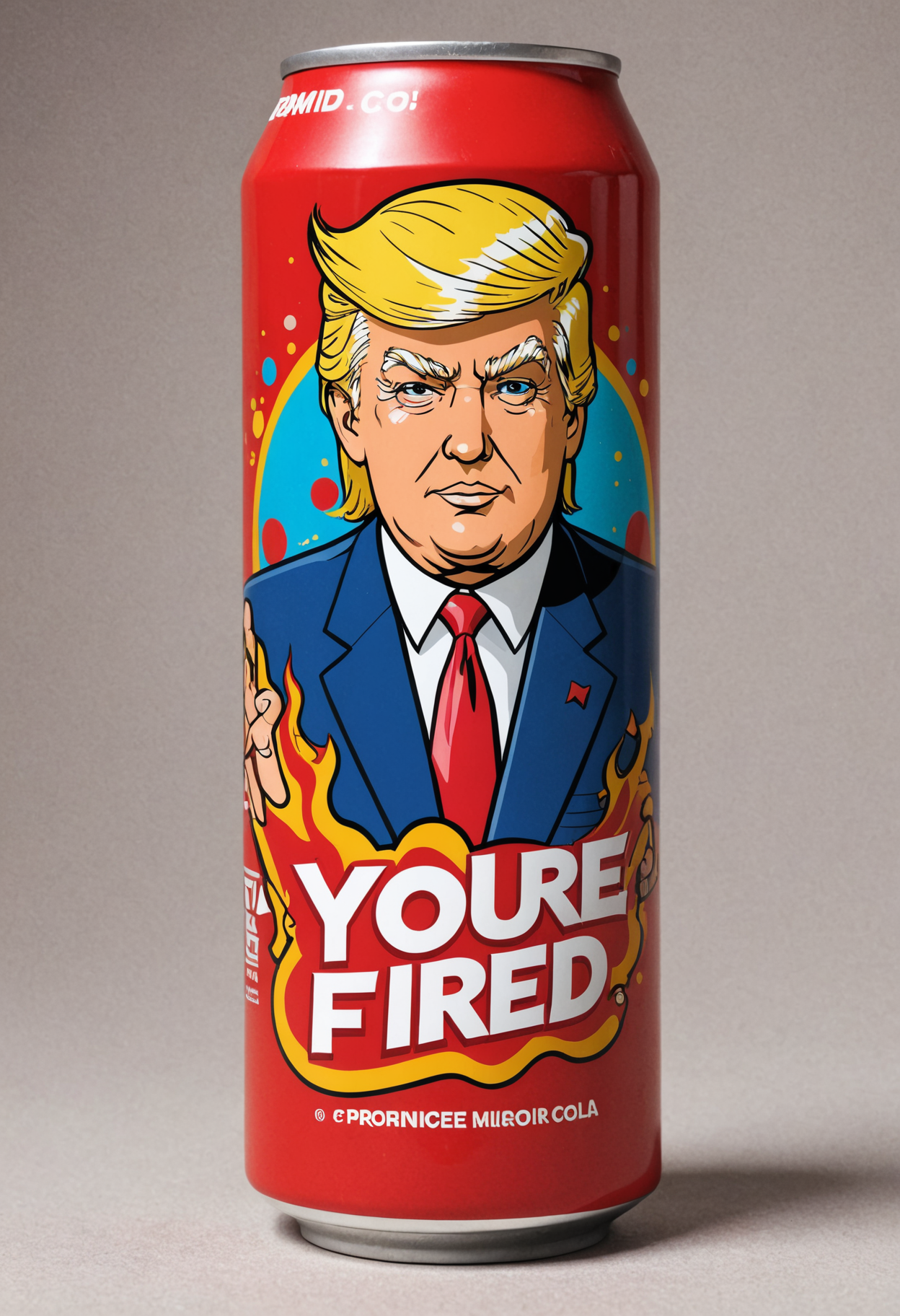 Donald Trump anthropomorphic cola can, iconic manga illustration, ("You're Fired Cola" text logo), edgy, psychedelic, kawaii, pop art