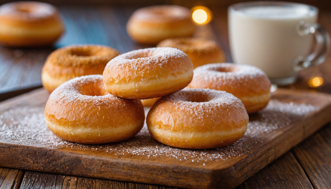 gourmet food photo of powdered donut, soft natural lighting, macro details, vibrant colors, fresh ingredients, glistening textures, bokeh background, styled plating, wooden tabletop, garnished, tantalizing, editorial quality
