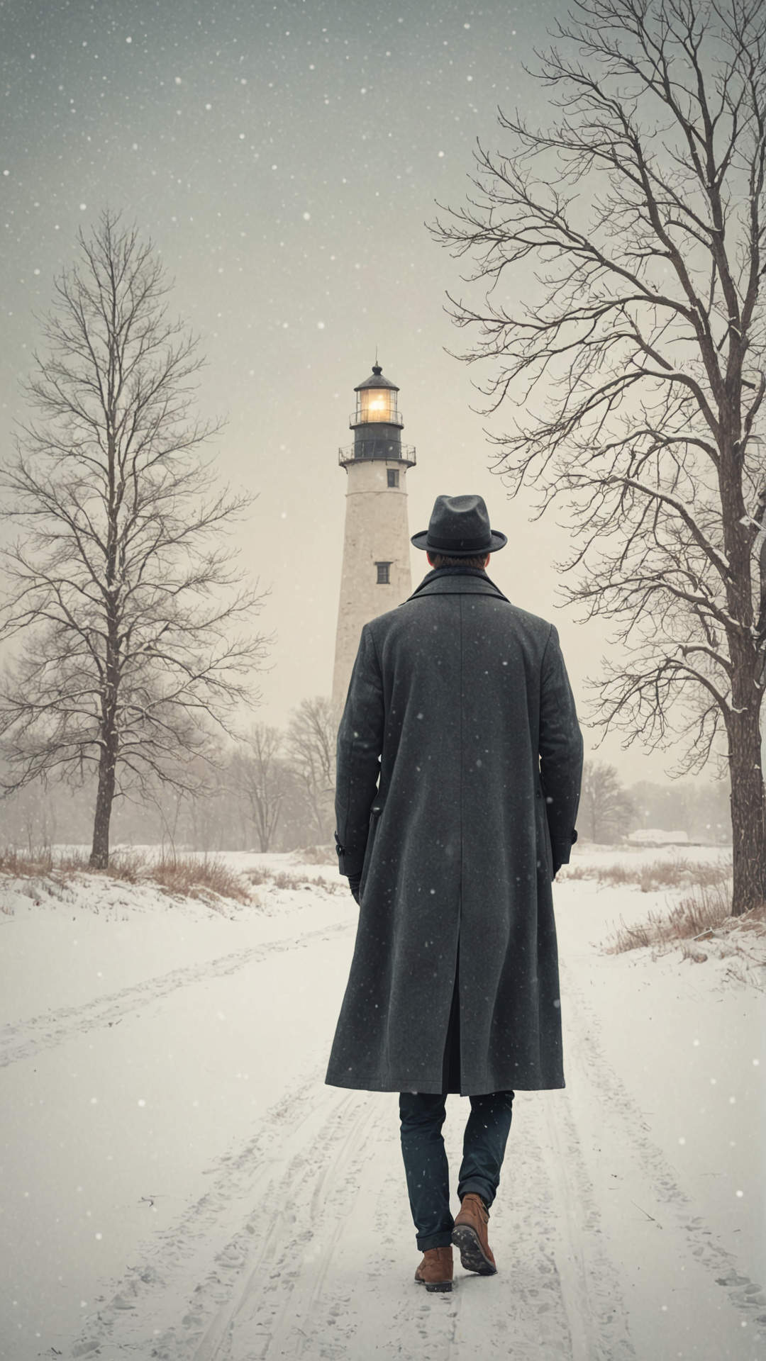 lighthouse, winter scene, snowflakes, male figure, overcoat, hat, flat illustration style, muted color palette, digital art, bare trees, rustic, solitude, contemplative mood, outdoor, daytime, snowy landscape, serene, simplicity in design, subtle textures, digital paint, artistic, faded background trees, cool tones, vertical composition, illustrative storytelling