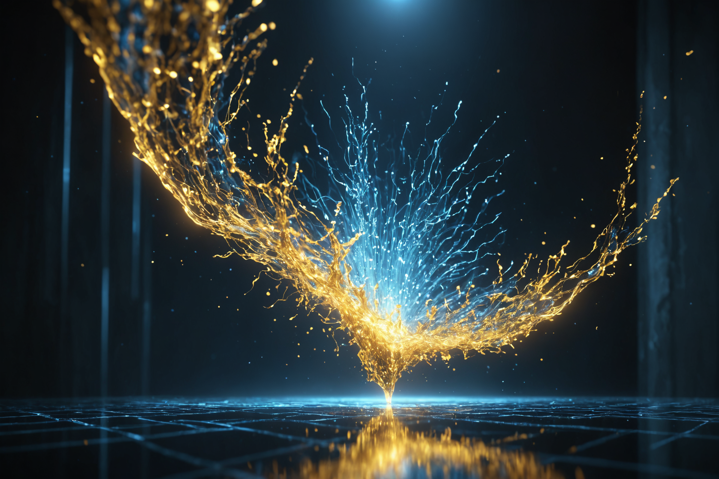 Movie still. Inside dataviz gold volumetric caustics, sparkling magical plasma aura, inside dark blue mist