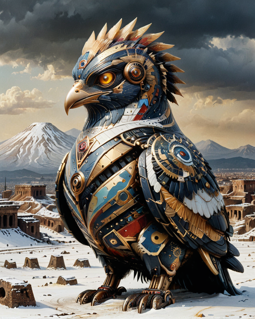 Thunderbird made of dvr-frft, Concept art, Oil painting, RAW photo, landscape of a Pompeii, surreal, Snowy, Atompunk, Canon EF, 800mm lens, three colors, <lora:xlMoreArtFullV1.pREw:0.6> <lora:dvr-frft:1>