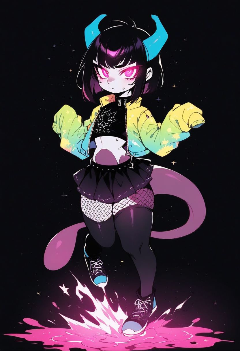 neondskdrmsxl, score_9_up, score_8_up, score_7_up, score_6_up, (sweaty, sweat 20yo beautiful woman pokemon femboy anthro mewtwo shortstack wearing childsh clothes,thigh high leggings,fishnet undershirt,short rocker skirt and a rocker crop top), standing, perfecteyes, shadowed face, zipper, black hair, multicolored jacket, patterned jacket, gradient overlay, rainbow glow, puddle, neon rainbow lightning, galaxy background, looking at viewer, pantyhose, sleeves past wrists, black background, long sleeves, glowing eyes, jacket, flying, source_anime, cinematic pose, cinematic angle, side lighting, outdoors, g0th1cxl<lora:NeonDreamsPonyXL:0.6>