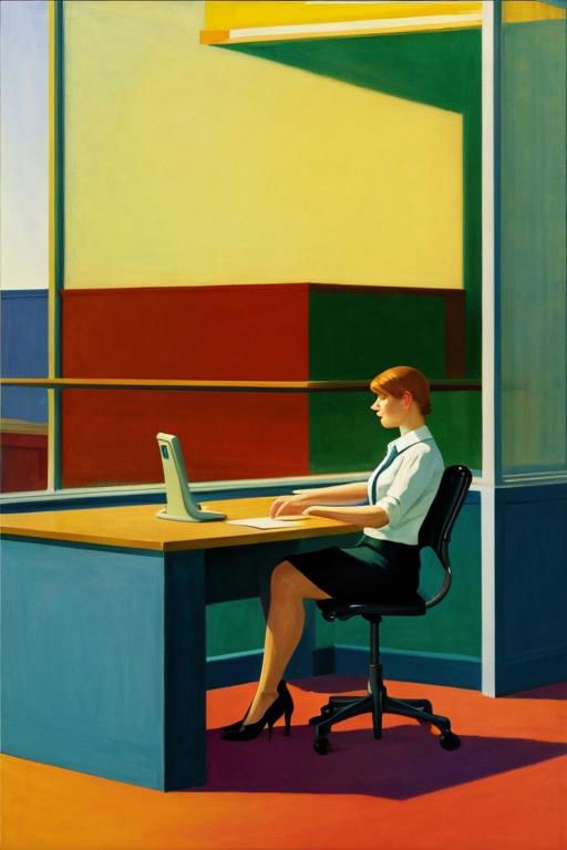 1 woman , beautiful, working, office, gradient, (art by Edward Hopper), high quality