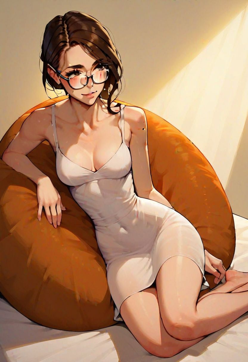 score_9, score_8_up, 30 years old, sundress, glasses, dark brown hair, sitting on a bean bag chair in a darkened room