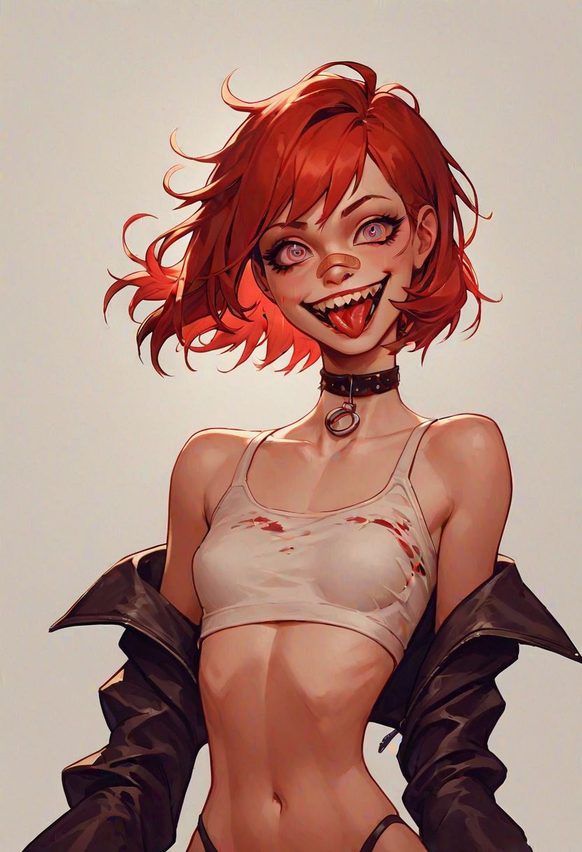 score_9, score_8_up, score_8, 1girl, yandere, short girl, standing, portrait, looking at viewer, face focus, medium hair, messy mair, shark teeth, half smile, tongue out, crazy eyes, red hair hair, (skinny:1.5), beautiful, fit thighs, black lether jacket, white crop top stained with blood, perky breasts, long sleeves, wide hips, bubble butt, thong, long boots fishnet stockings, choker, in back alley, bloody face, (nose bleed:1.2), blood on face, nose bandaid, blood stained crop top