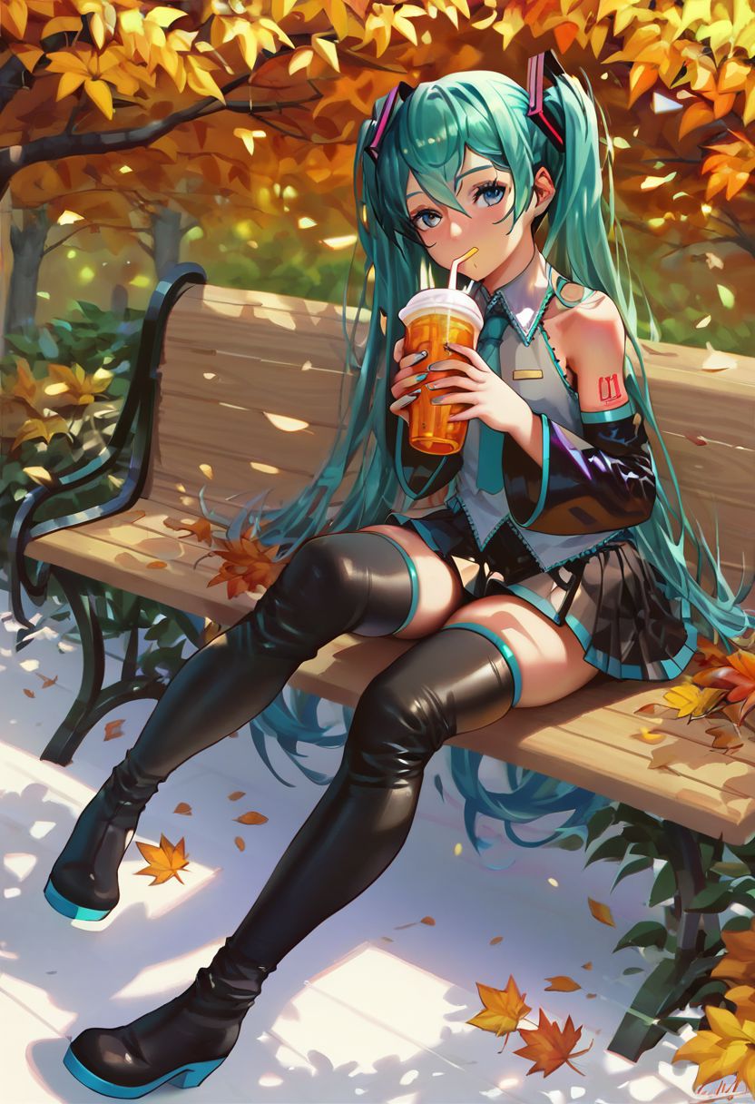 score_9, score_8_up, score_7_up, a girl is sitted on a park bench drinking a juice, hatsune miku, looking at viewer, black thighhighs, black detached sleeves, black skirt, thigh boots, autumn, <lora:ra_xl_v2:.8>