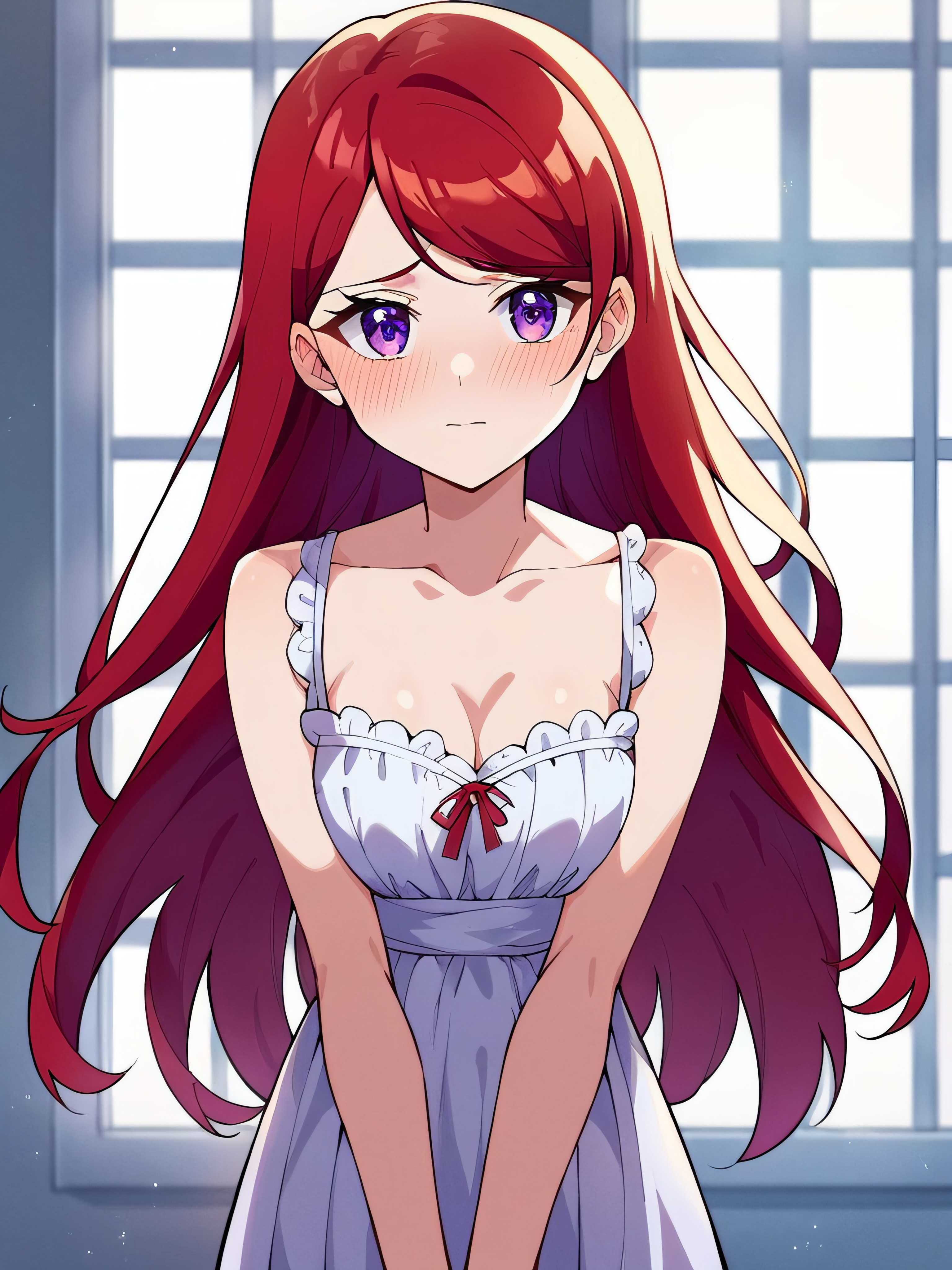 score_9, score_8_up, score_7_up, score_6_up, rating_explicit, anime_source, (perfect hands),1girl, girl looking at viewer, standing, <lora:pride_royal_ıv:1>,(pride royal ıv:1.2), red hair, long hair, purple eyes, swept bangs, blush, medium breasts, (cowboy shot), ( perfect anatomy:1.2), cinematic shadow, cinematic light, collarbone, cute and sensitive, shy, naughty maid, bare shoulders, soft skin, v arms,