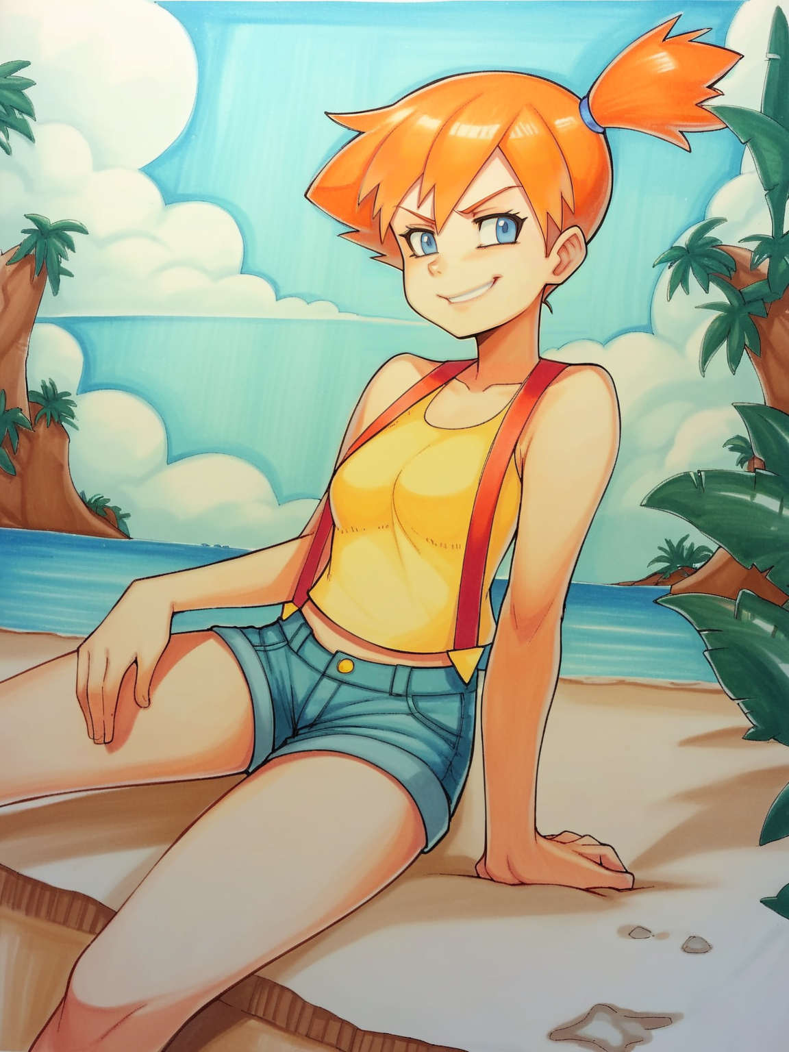 score_9, score_8_up, score_7_up, score_6_up, score_5_up, score_4_up, BREAK, source_anime, 1girl, misty \(pokemon\), orange hair, wearing a yellow crop top and a short shorts, smirk, sea, blue sky, sand, marker \(medium\), traditional media, tropical island background <lora:OmarDogantXL:1>