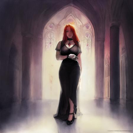 (art by dean yeagle:1.3), 1girl, standing, in a town, (town:1.4), red leather bodysuit, <lora:ConfettiTail:1>, red hair, solo