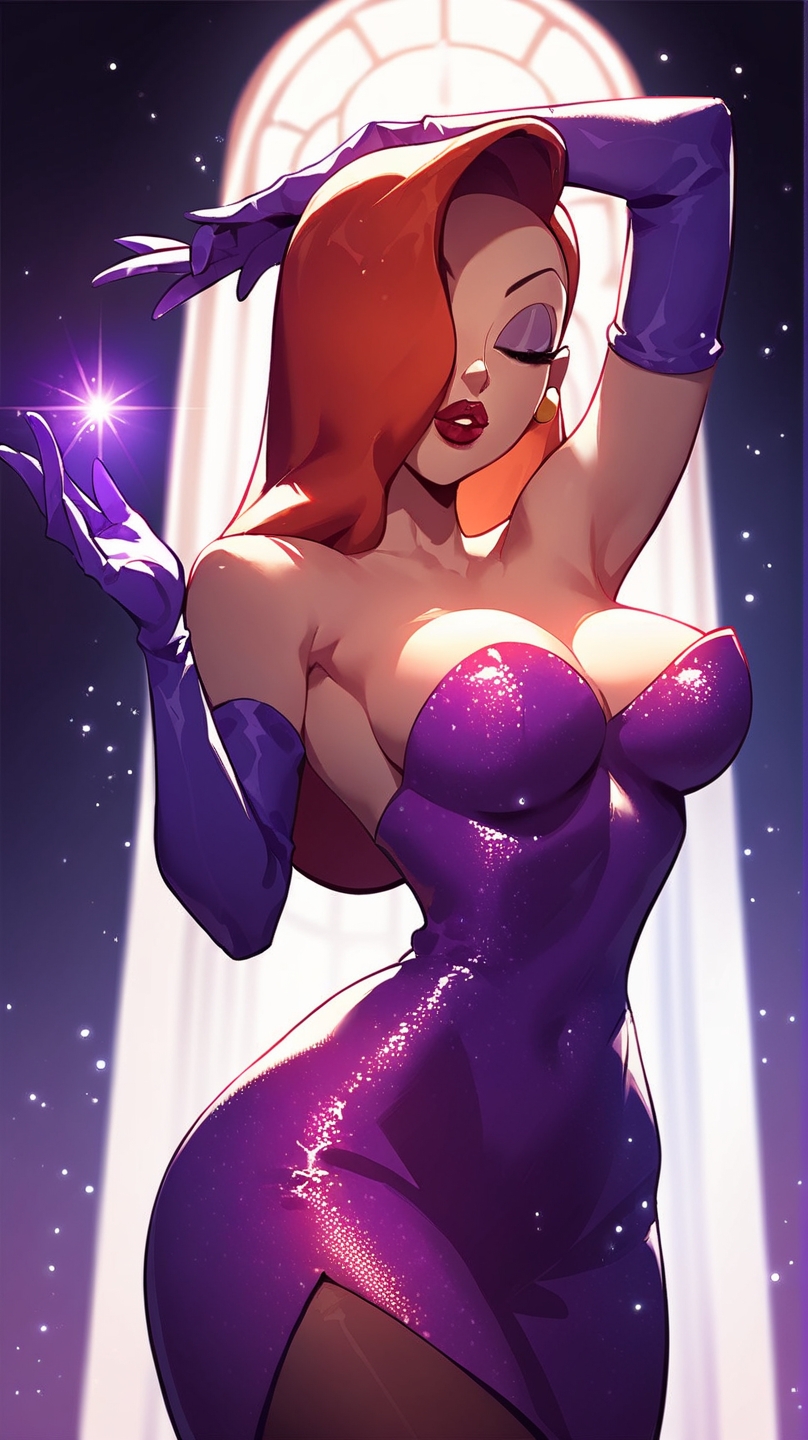 score_9,score_8_up,score_7_up,source_cartoon,source_anime,1girl,intricate,highly detailed,soft lighting,soft particles,glowing,concept art,<lora:Smooth Anime 2 Style SDXL_LoRA_Pony Diffusion V6 XL:1>,medium breasts,curvy,jessica rabbit,