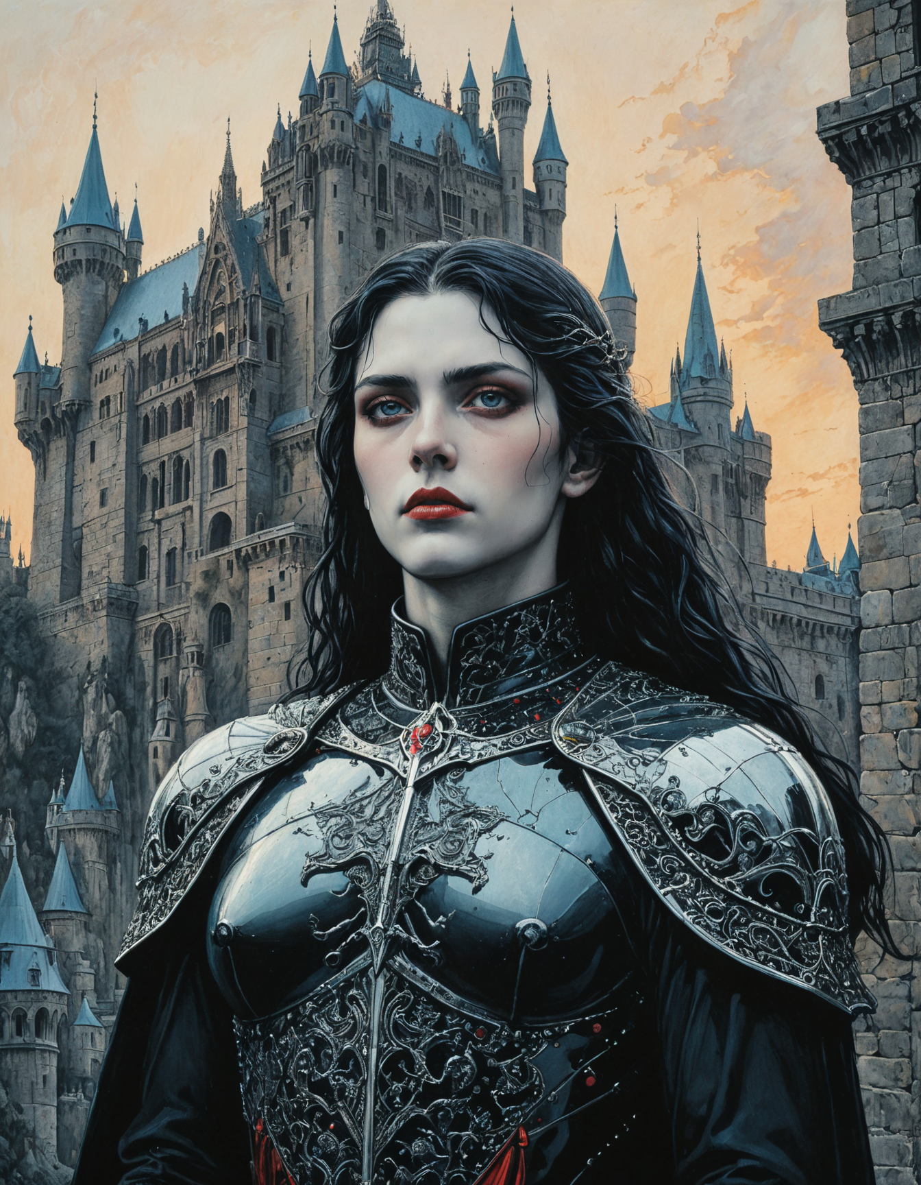 ([by Apollonia Saintclair|by Louis Rhead]:1.5), (Dracula, the king of ancient mythology, descends upon his prey, clad in a regal costume and holding a majestic castle. The prey's eyes widen as it gazes out at the sky, its scales shimmering in the sunlight. It reigns over his gothic castle, its walls adorned with intricate carvings and hieroglyphic symbols. The scene is set against a backdrop of towering Gothic architecture and enigmatic creatures.:0.5) (Dreamscape:1.3) <lora:xl_more_art-full_v1:0.5> <lora:add-detail-xl:0.7> <lora:MJ52:0.4>