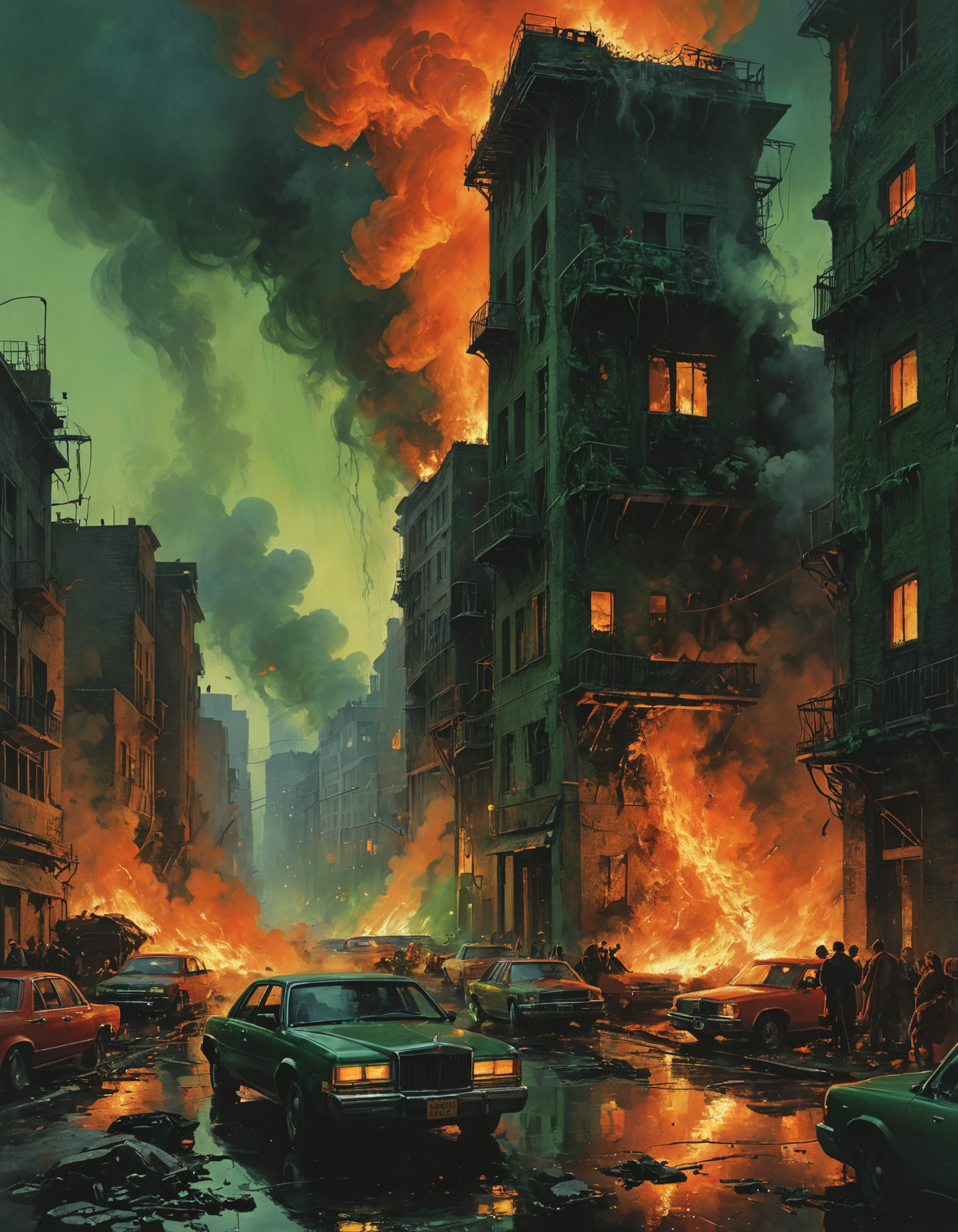 ([by John Philip Falter|by Clyde Caldwell]:1.5), (The air is thick with a deadly gas leak, engulfing the urban area in a torrent of fumes. Twenty-five feet tall, twisted and twisting explosions spread out before the viewer, spreading to the ground like a serpent. Insidious fumes spread, silent, causing panic and chaos, as the city below comes alive with a deafening roar. The air is filled with a sickly green glow, illuminating the scene with its fiery red hue.:0.5) (Luxurious Elegance:1.3) <lora:xl_more_art-full_v1:0.5> <lora:add-detail-xl:0.7> <lora:MJ52:0.4>