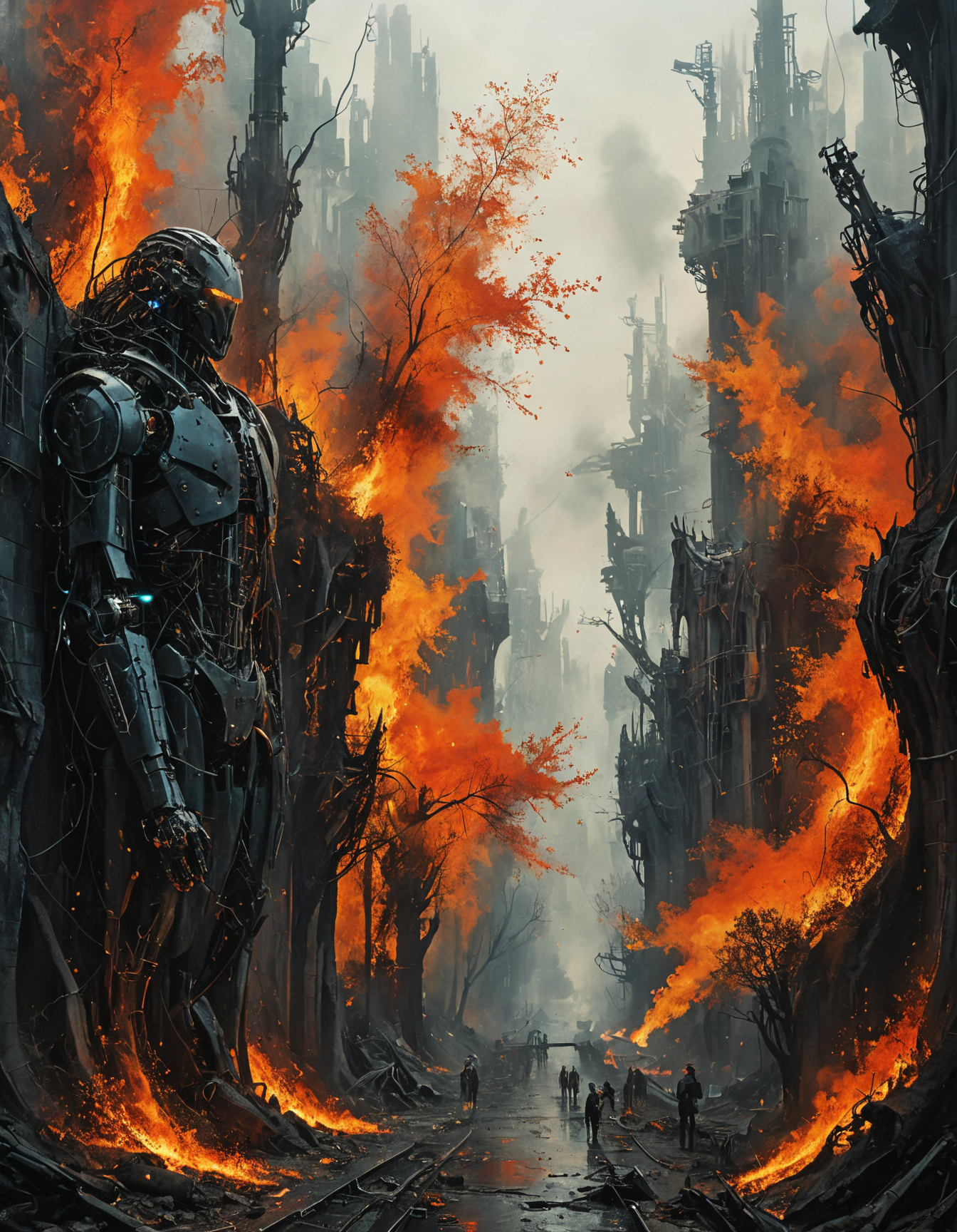 ([by Antoni Gaudí|by L. S. Lowry]:1.5), (The forest is engulfed in a fiery red and orange flame, its branches reaching out like wings. Debris and ash spew from the trees, leaving scorched earth in its wake. The air crackles with energy as the wildfire spreads through the forest, sending plumes of smoke into the sky. It's an unstoppable sight, a testament to the power of nature to unleash this deadly force.:0.5) (Dystopian cybernetic:1.3) <lora:xl_more_art-full_v1:0.5> <lora:add-detail-xl:0.7> <lora:MJ52:0.4>