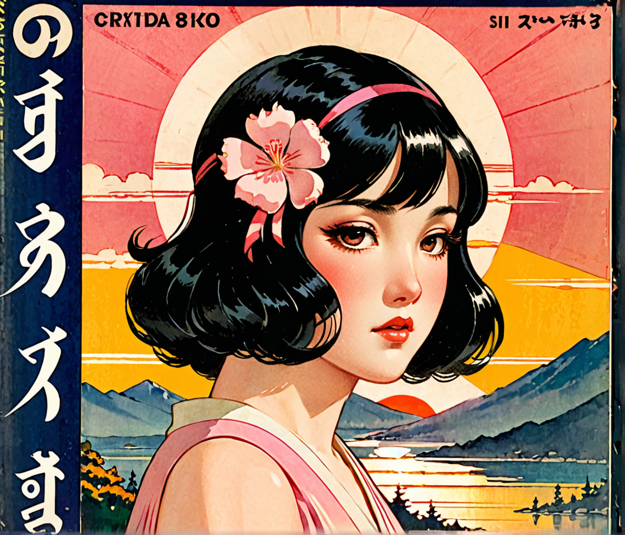1920s commercial illustration of score_9, score_8_up, masterpiece, best quality, ultra quality, sharp focus, japanese girl, sad expression, long black hair, pink eyes, break setting sun in background , magazine cover illustration from the 1920's, exaggerated realism, a hint of caricature